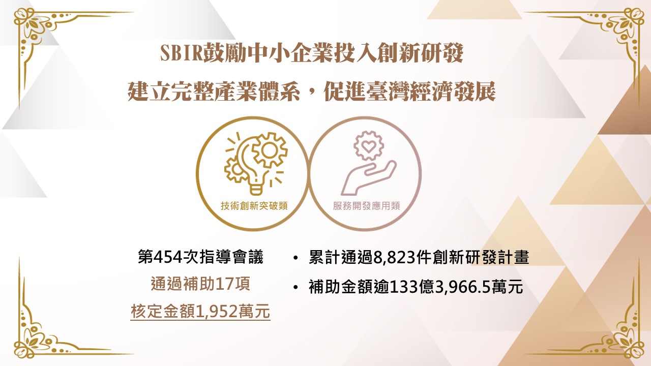 The Small and Medium Enterprise Administration(SMEA), Ministry of Economic Affairs(MOEA) organized the No. 454 Steering Committee for the Small Business Innovation Research Program (SBIR) in which it reviewed and passed subsidies for innovative technology/service research projects for 9 projects in the technological innovation breakthroughs sector, 8 projects in the service development and application sector, totaling 17 projects proposed by SMEs.