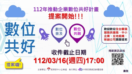 為落實與推動企業數位共好並形塑特色,本計畫以9 人以下小微型企業為輔導對象,以特色主題或業種特性共通應用需求為核心 ,整合企業互助共榮發展,輔導導入適性化雲端或數位工具,協助小微型企業數位化、數位優化發展。歡迎全台雲端服務供應商、中小企業、在地組織、新創公司踴躍提案。