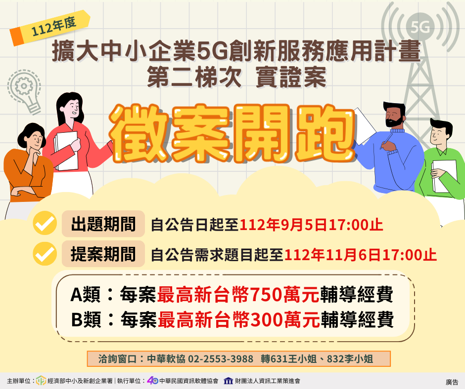 二、實證案徵案機制說明:本次實證案採出題解題徵案方式,公開徵求營運端提出需求題目、解方業者提出符合營運端的需求發展之5G創新應用服務,促進供需雙方合作實證。