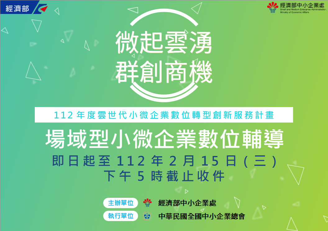 由經濟部中小企業處委託中華民國全國中小企業總會辦理之「112年度雲世代小微企業數位轉型創新服務計畫-場域型小微企業數位輔導」即日起開始受理提案。本計畫以小微企業為輔導對象,透過導入雲端解決方案及推動數位行銷,達成數位化與創新服務之目的,提升營運效能、推動數位行銷及拓展商機。