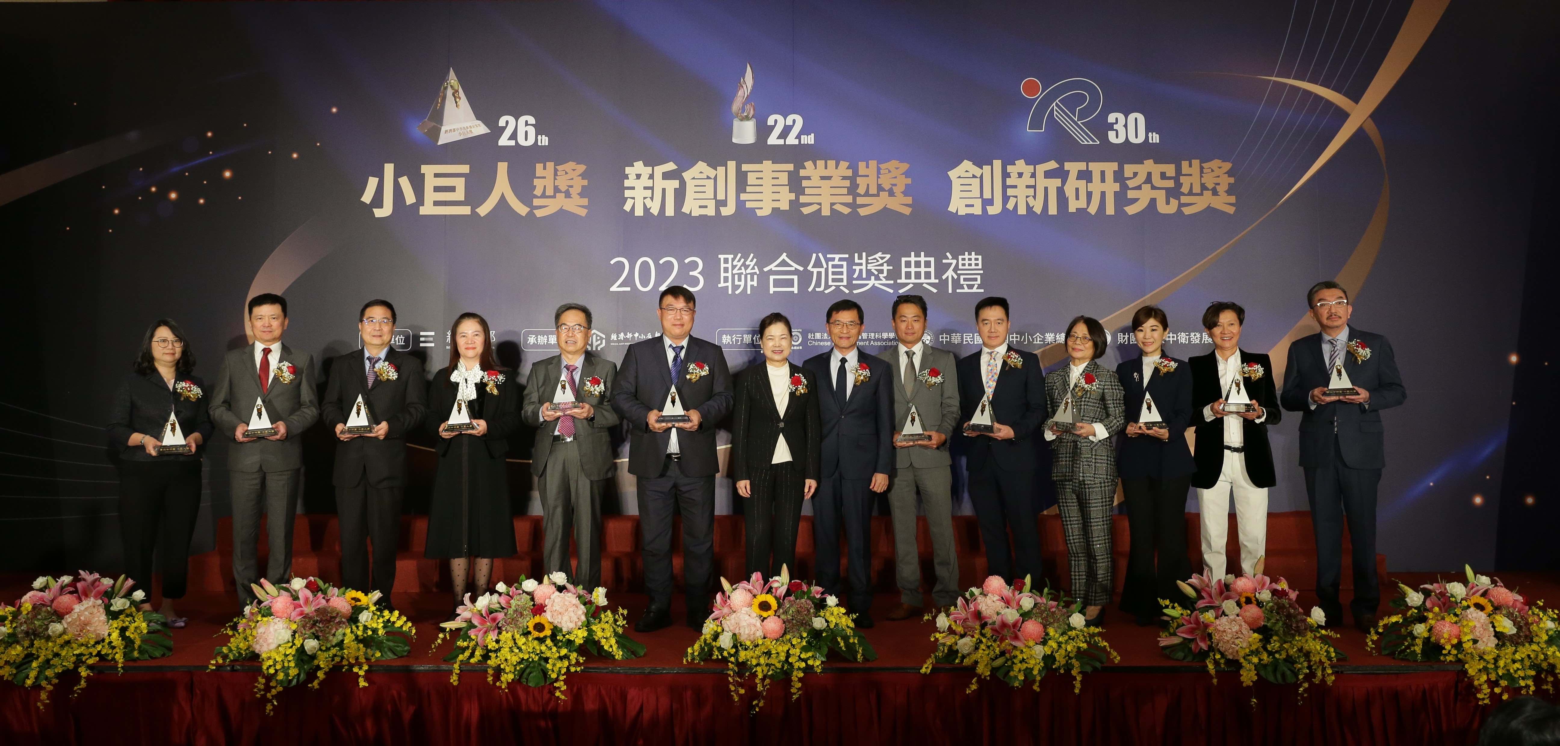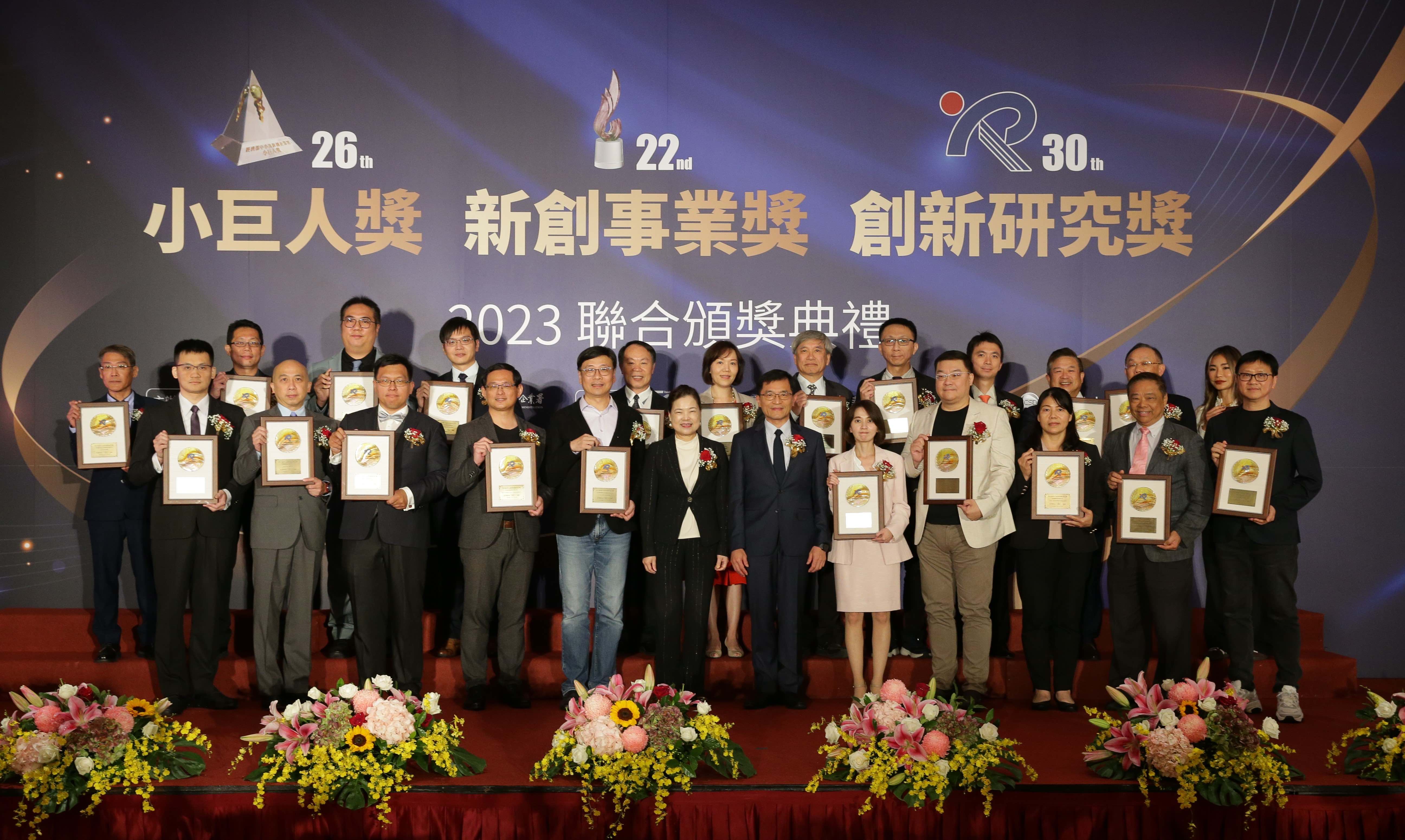 經濟部主辦的第26屆小巨人獎、第22屆新創事業獎及第30屆中小企業創新研究獎聯合頒獎典禮,於11月22日在臺大醫院國際會議中心201室舉行。今(112)年度有12家出口績優企業獲選小巨人獎、20家新創企業獲得新創事業獎及22件創新標的獲創新研究獎, 54家優秀得獎企業,由經濟部王美花部長親臨頒獎祝賀,與現場來賓分享得獎喜悅與榮耀。