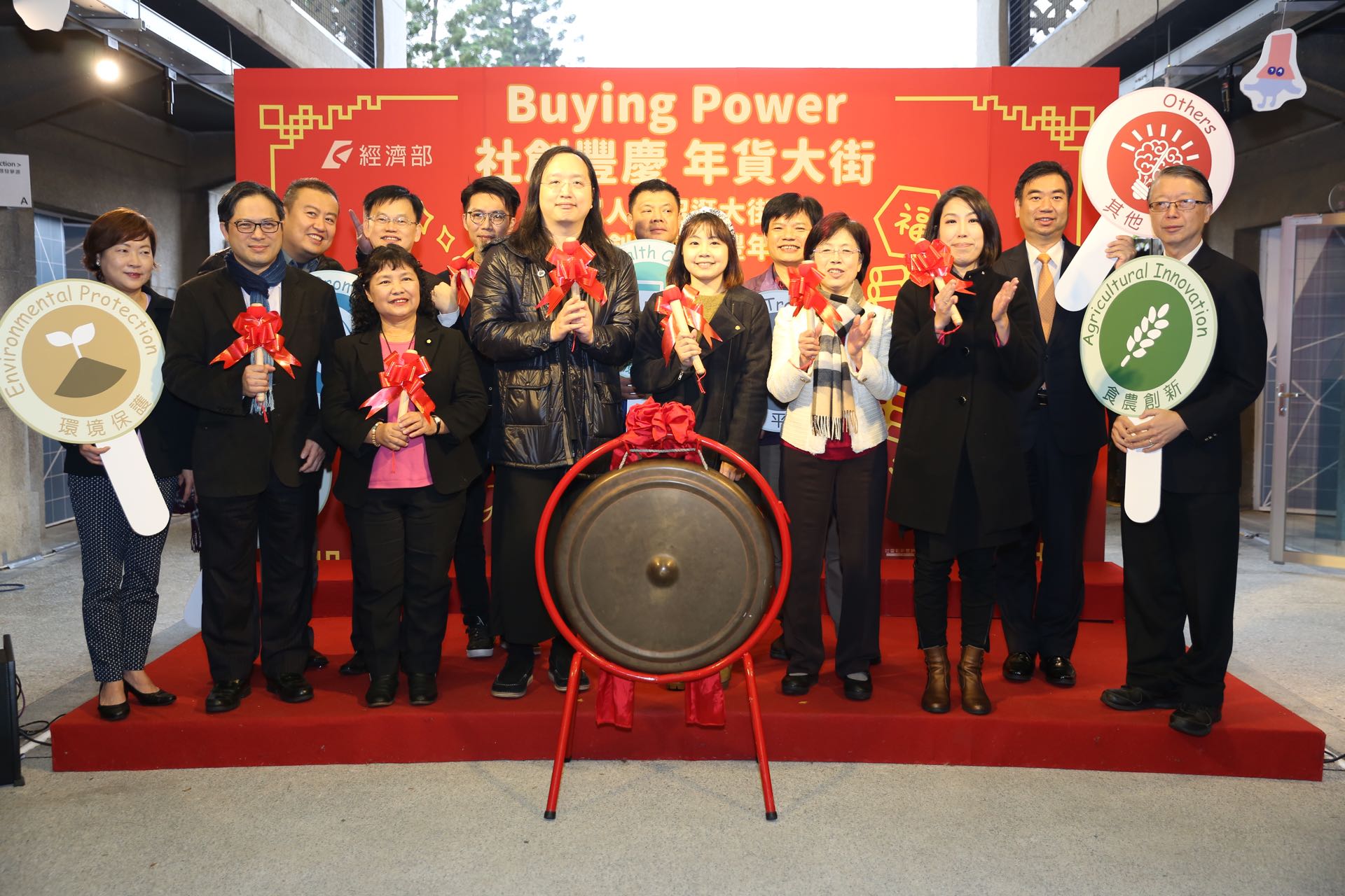 為促進我國社會創新企業持續性的商機,經濟部中小企業處自1月5日至6日連續兩天於社會創新實驗中心舉辦「社創豐慶 年貨大街」, 6日特別邀請社創企業代表愛物資(iGoods)邱珮瑜營運長、點點善葉文宏創辦人與行政院唐鳳政委、立委余宛如、尤美女、陳曼麗、經濟部中小企業處吳明機處長、中小企總戴麗芬秘書長、台北市青創會宋京達理事長、新北青創會吳有田理事長、國泰金控廖昶超協理、星展(台灣)商業銀行何子明董事總經理、KPMG安侯建業聯合會計師事務所于紀隆主席、台北市大安區民輝里陳威禎里長共同「敲」響熱賣「鑼」,為今年Buying Power揭開序幕。