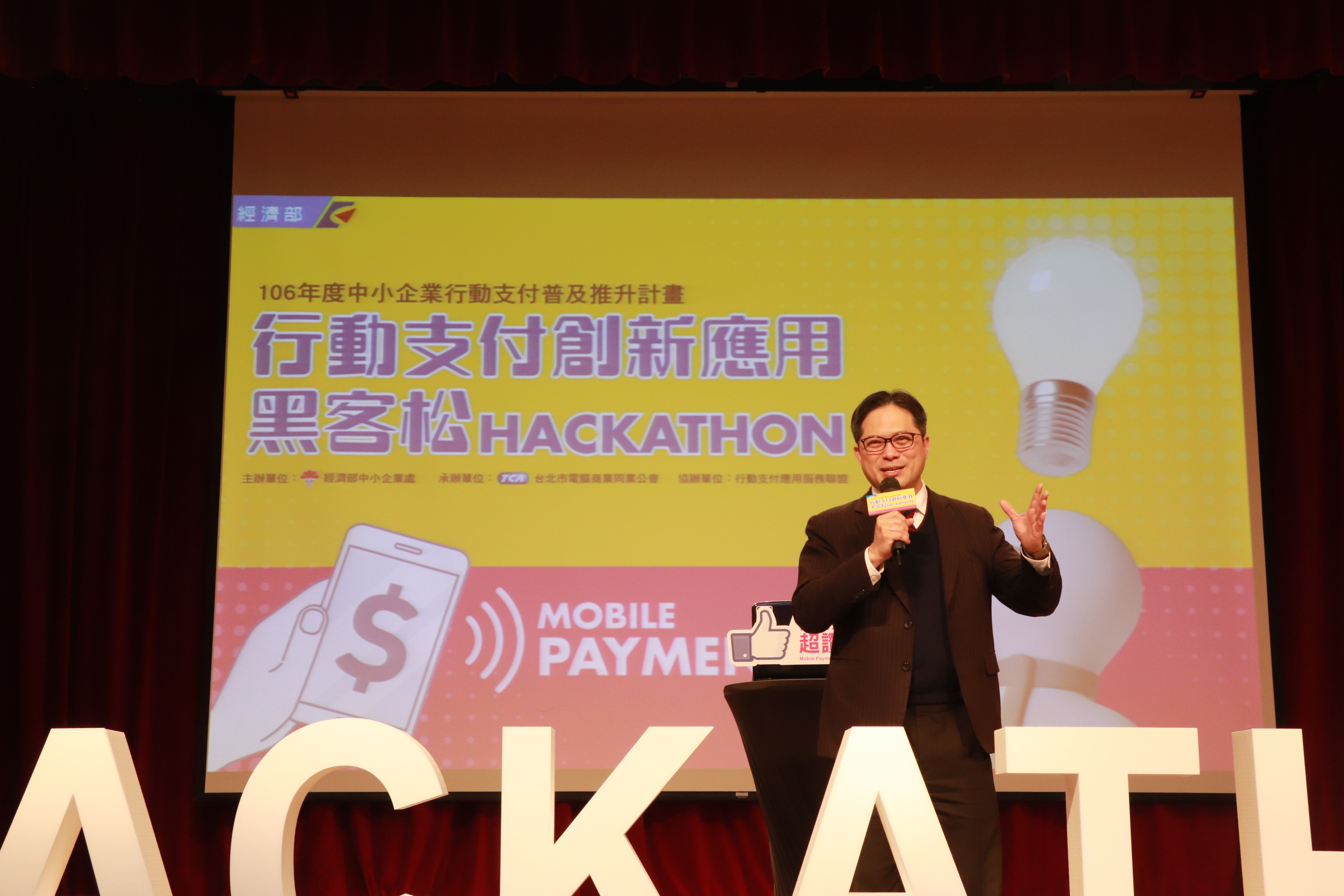 中小企業處吳明機處長致詞時表示,經濟部已從「完備行動支付基礎環境」、「擴大行動支付應用場域」、及「加強行動支付體驗行銷」等策略面向,推動多項普及措施,然而臺灣行動支付的整體環境與國際不同,臺灣的支付方式多元,是創新應用的搖籃,希望透過這次黑客松的集思廣益,可以獲得貼近民眾的嶄新應用。