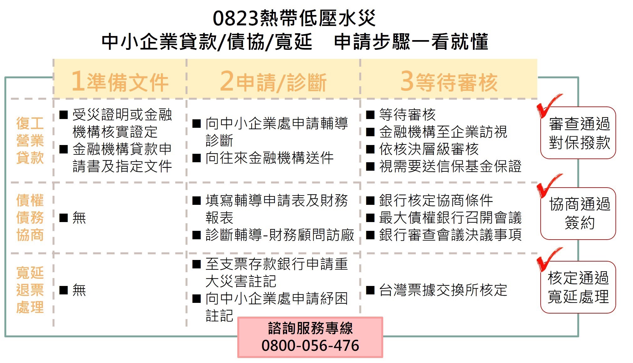 受災中小企業貸款/債協/寬延申請步驟,以及各縣市服務網絡窗口,業公布於經濟部中小企業處網站(www.moeasmea.gov.tw)之業務消息專區,相關資訊中小企業可向「馬上辦服務中心」免付費服務專線0800-056-476洽詢,亦可直接就近向各縣市中小企業服務網絡提出申請。
