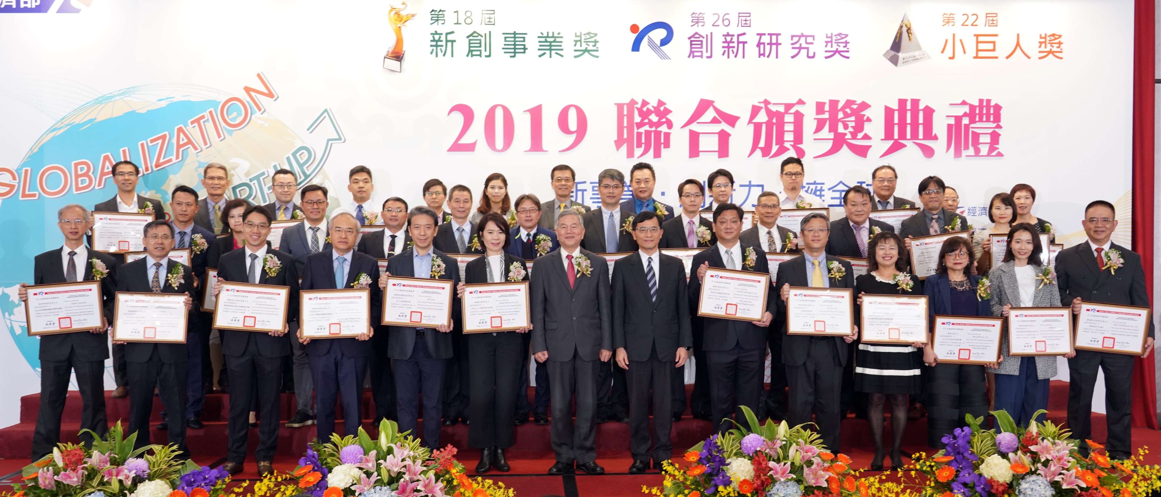 我國中小企業是經濟發展的重要推手,經濟部主辦的第18屆新創事業獎、第26屆創新研究獎及第22屆小巨人獎聯合頒獎典禮,於11月13日(星期三)下午4時30分,在臺大醫院國際會議中心201廳舉行。今(108)年度有16家新創企業獲選新創事業獎、37件創新標的獲創新研究獎及14家外銷績優企業當選小巨人獎,共選出67家優秀得獎企業。今年獲獎的企業積極進取、各具特色,實為我國經濟活力的具體代表,由經濟部沈榮津部長親臨頒獎給予鼓勵與支持。