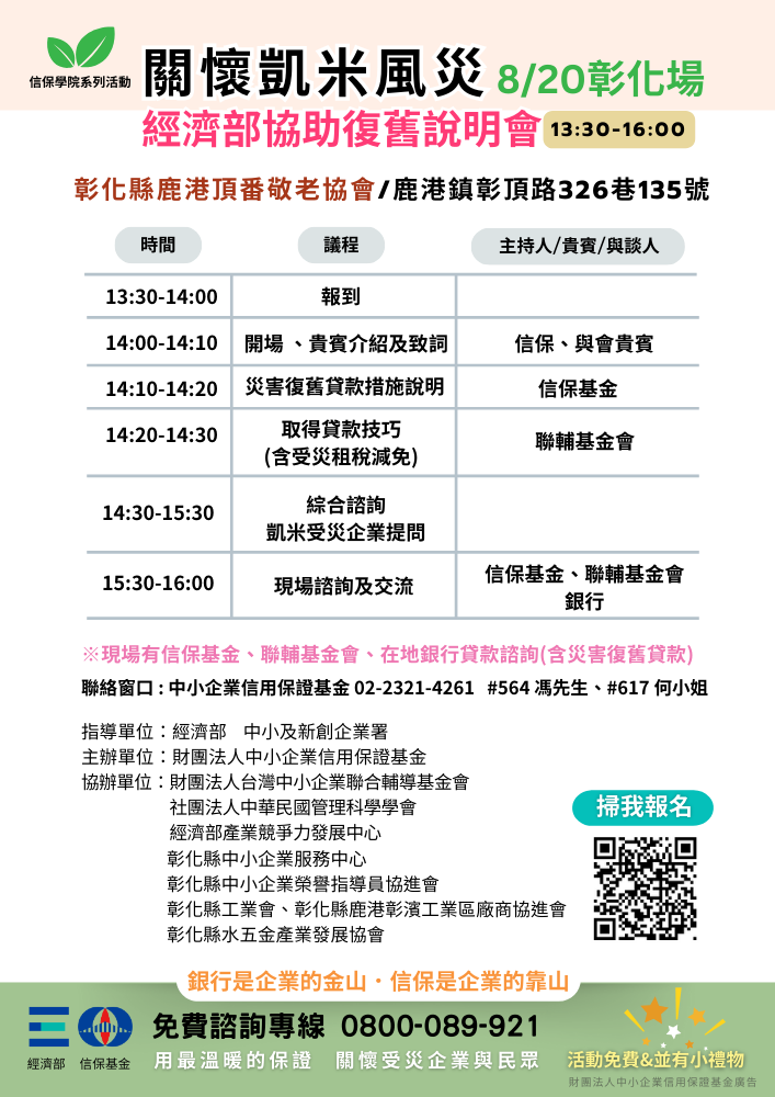 因凱米颱風災情影響,欲申請疫後振興專案貸款之事業,聯輔基金會將可開立「凱米風災-資格認定 (受影響)證明」,請活動當日攜帶(1.公司大小印章;2.紙本受災照片2張),或線上填寫申請(https://fcs.cma2.org.tw/0800/0724typhoon/index.php)