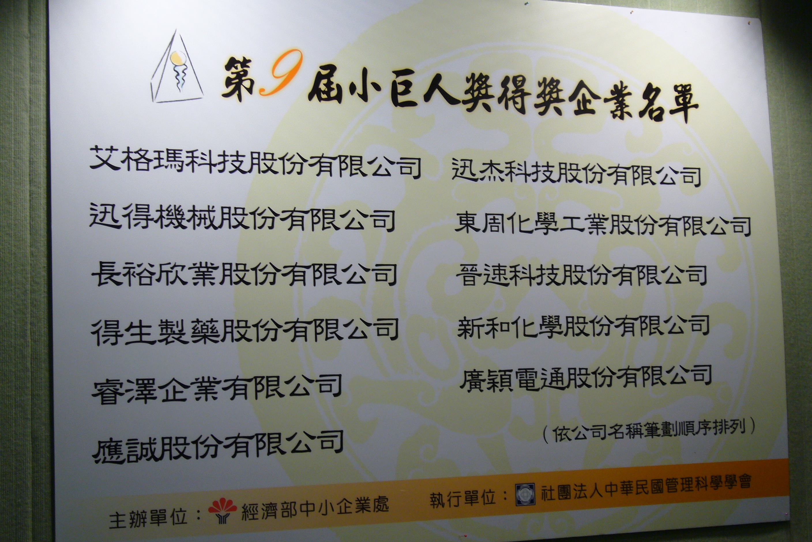 經濟部中小企業處所主辦的「小巨人獎選拔表揚計畫」,不管是對台灣未來的經濟發展,或是全球競爭趨勢而言,皆具有承先啟後的深遠意義,值得重視與鼓勵。其所拔擢的企業,不但在產品外銷上有優異的表現,而且經營體質健全,具有發展潛力,對增強我國家競爭力是相當有貢獻的,舉辦本項表揚活動不僅是對中小企業的肯定,更代表了對其未來發展的期許,希望能鼓勵中小企業積極增進經營績效,開拓更寬廣的國際市場空間。