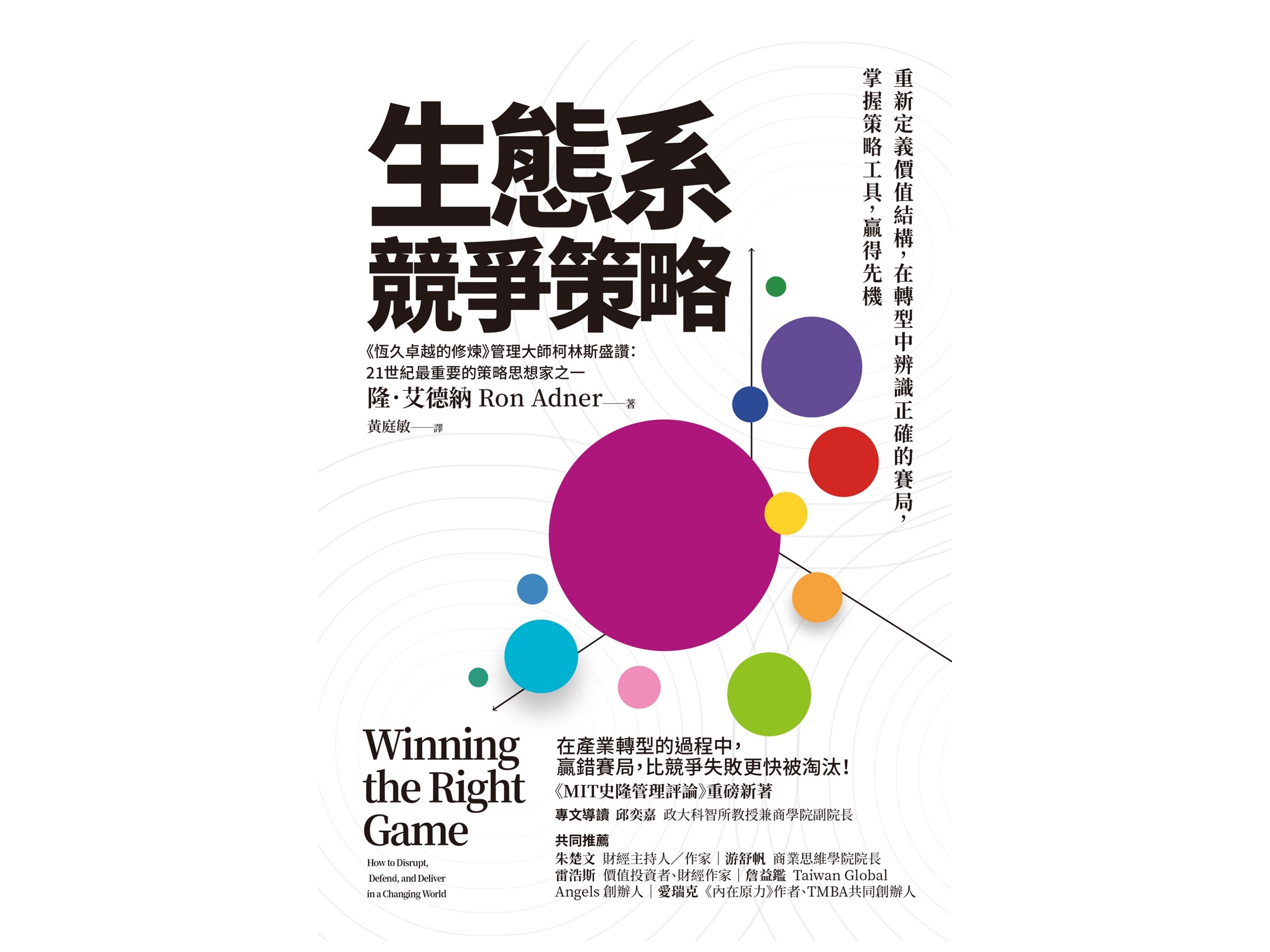 本書剖析生態系顛覆的動態,闡述各類產業經典的實務案例,可以提供中小企業業者嶄新的策略思維。作者隆・艾德納(Ron Adner) 是生態系競爭策略的大師,以淺顯易懂,條理清晰的邏輯,搭配豐富的知名案例,提出生態系統競爭策略,不僅有助分析、整合資源,也能辨析產業及中小企業的價值元素所在,順應時勢迎戰生意場上多樣變化的挑戰。