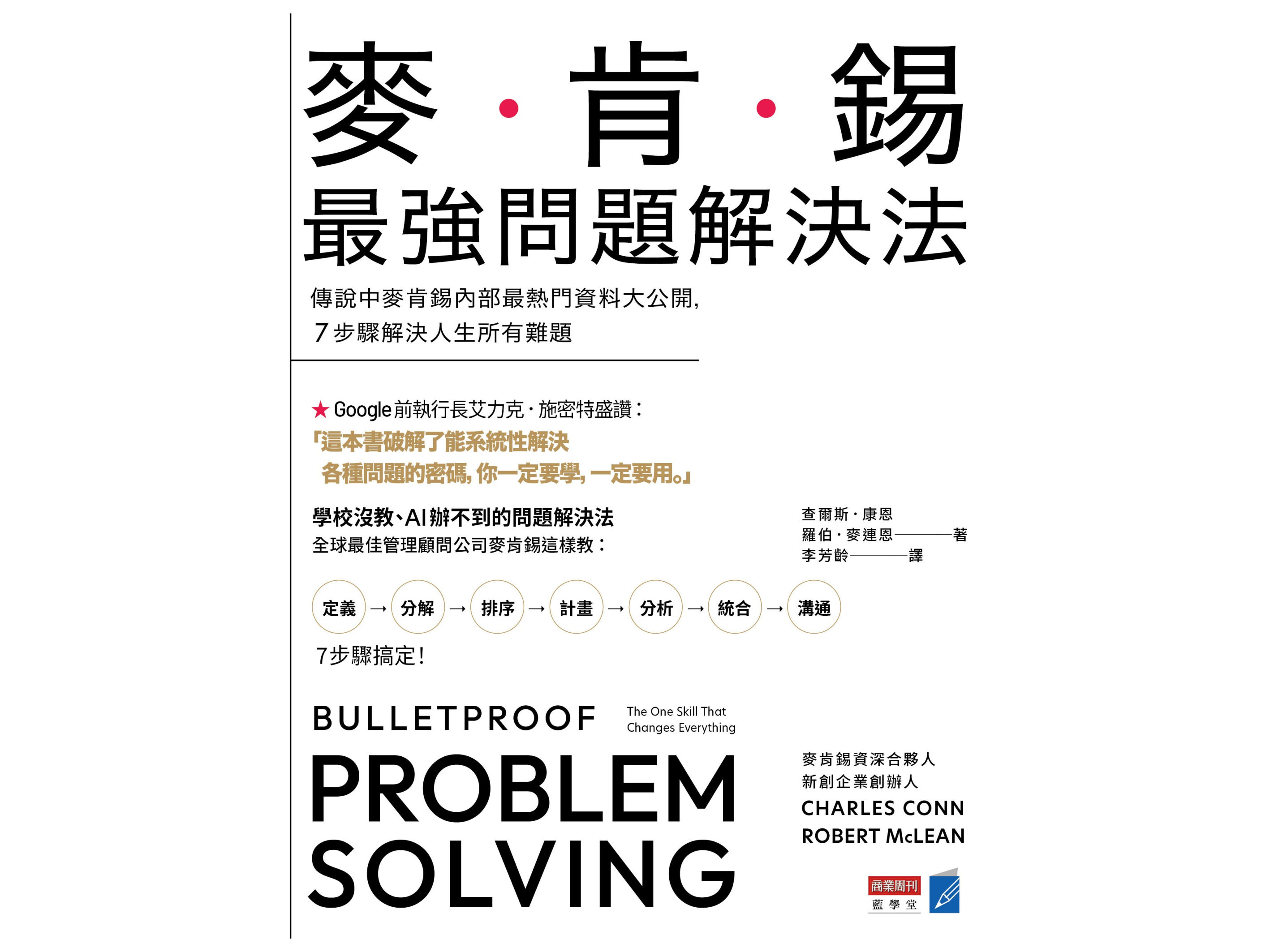 麥肯錫為提供複雜問題對策而聞名的顧問公司,本書提供7大系統化的問題解決步驟:定義問題、分解問題、問題排序(優先順序) 、擬定計畫(具體流程及時間) 、分析(收集事實與檢驗假設)、統合(整合分析結果)、溝通(具說服力溝通),有別於其他思考解決方法,書中亦提供90張邏輯樹、7步驟思考等圖表,便於讀者拷貝、修改及運用。