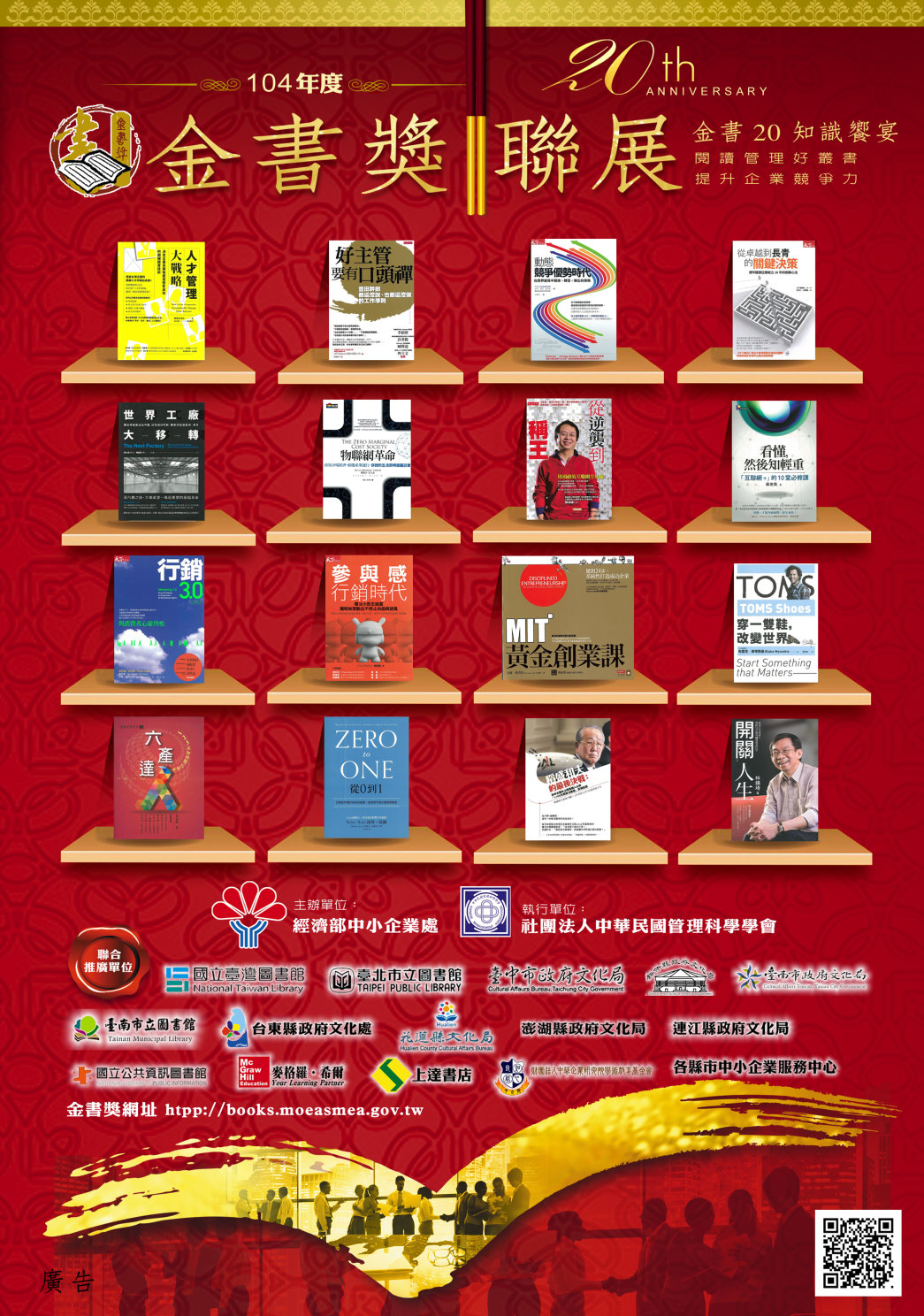 104年度金書獎聯展活動開跑囉!於經濟部中小企業處各服務中心、全國各縣市政府文化局、圖書館、上達書局、美商麥格羅希爾出版社等地推廣,歡迎中小企業朋友共襄盛舉。