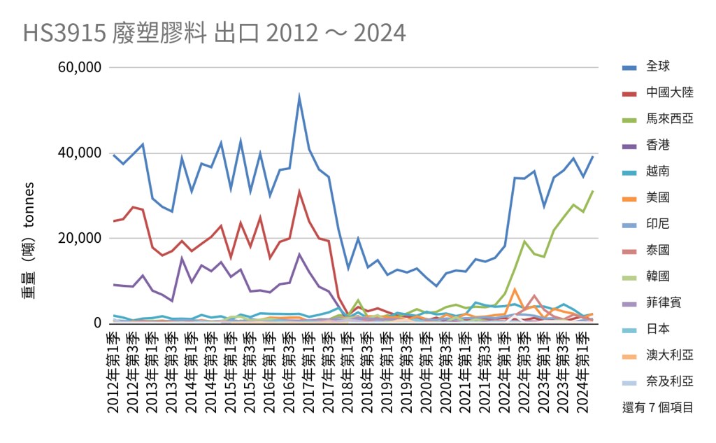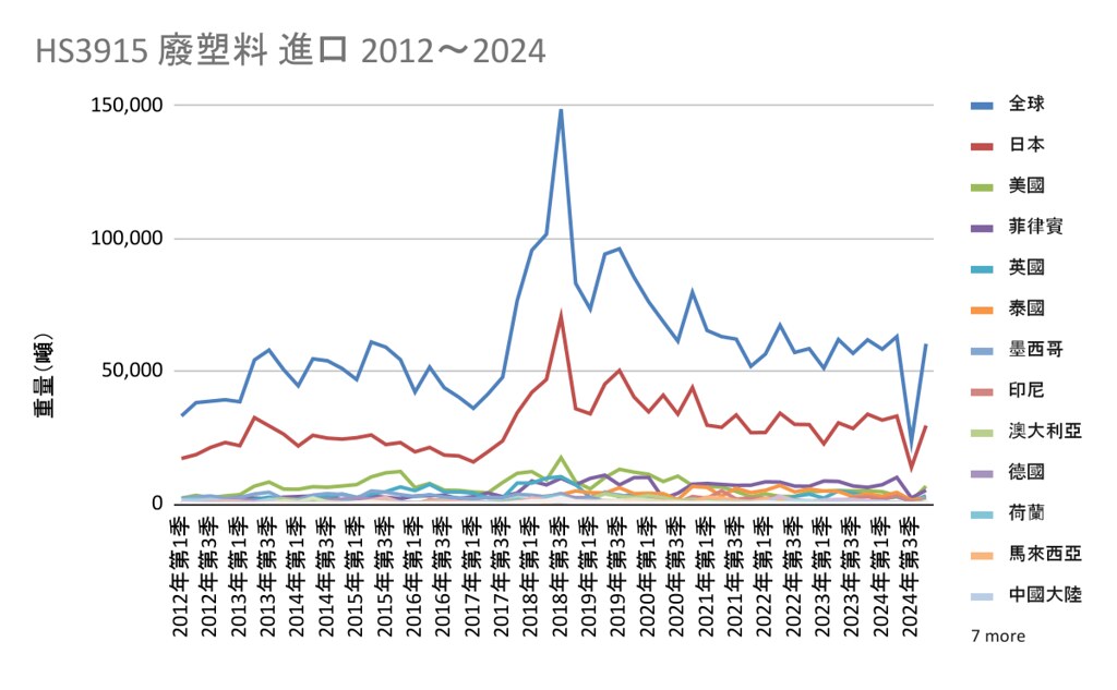 圖2. 2012-2024年各國廢塑膠輸入我國情形。圖片來源:看守台灣協會