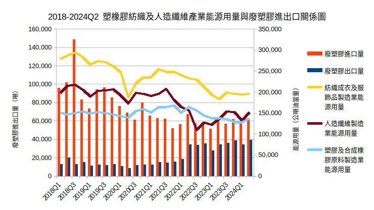 圖4 . 2018-2024Q2塑橡膠、紡織及人纖產業能源用量與廢塑膠進出口關係圖。圖片來源:看守台灣協會