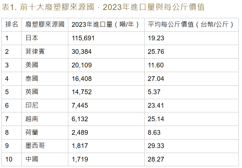 表1.前十大廢塑膠來源國,2023年進口量與每公斤價值