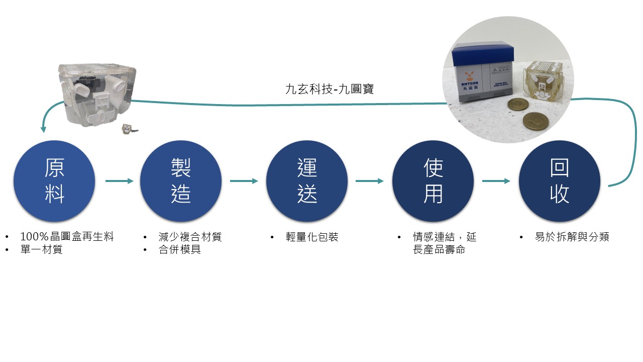 在塑膠中心創新設計組與九玄科技的共同構思下,「九圓寶」採用回收晶圓盒再製的rPC塑膠料生產,並以單一材質成型。原先複合材質的細節則以印刷方式呈現。製程上,上蓋與盒體採共模設計,以降低模具開發成本與材料用量。雖上蓋設有矽膠密封條以強化密合,但採可拆式組裝結構,方便後續回收分類。