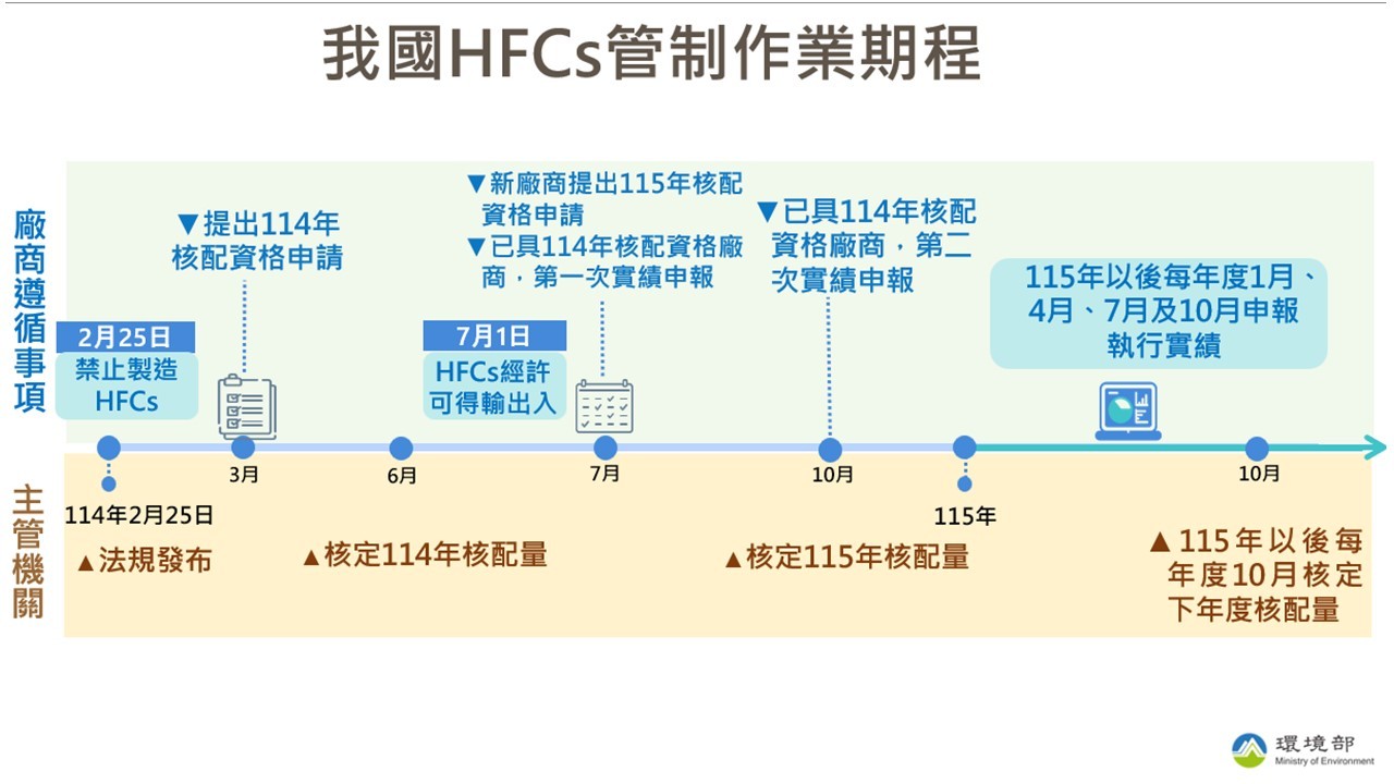 環境部配合國際公約加嚴管制氫氟碳化物(HFCs),以減少高溫暖化潛勢(GWP)氣體的影響,逐步降低國內消費量。