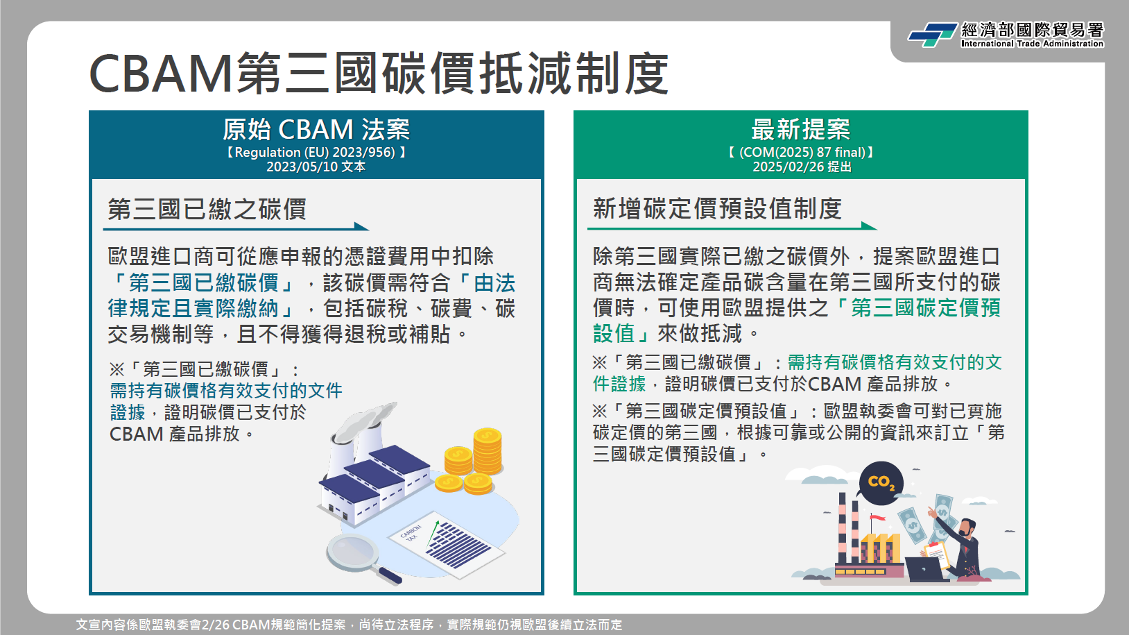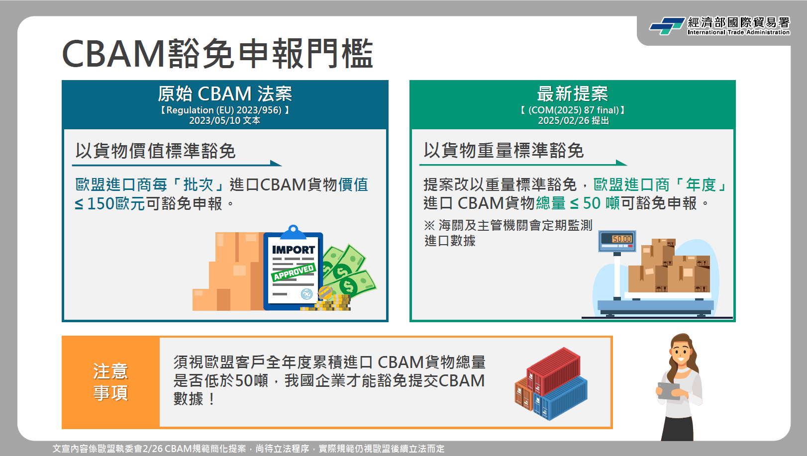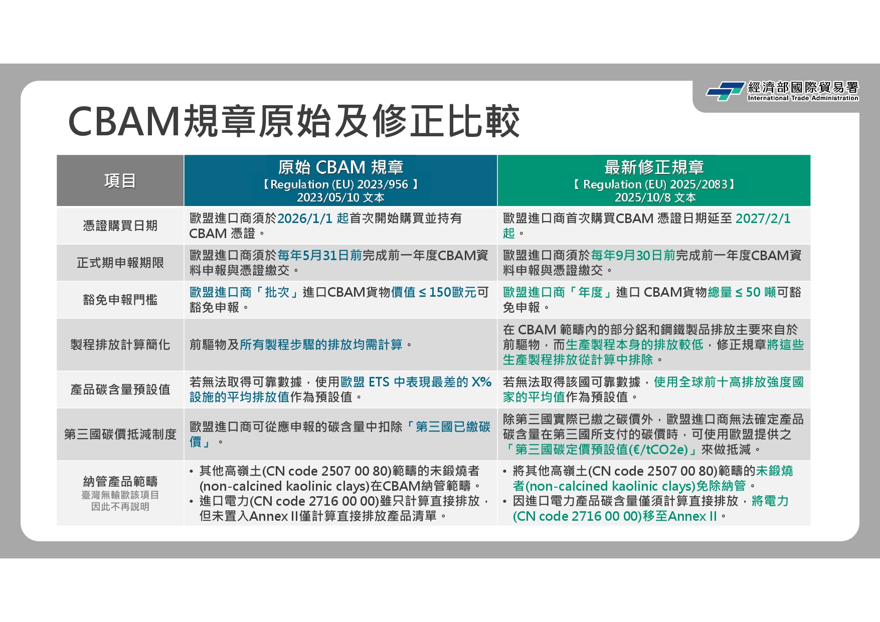 歐盟執委會於2025年2月26日提出之CBAM簡化草案重點,說明與原始法案差異,包括:將豁免門檻由「批次價值150歐元」調整為「年進口量50噸」、延後憑證購買及申報繳交時間、簡化部分製程排放計算、更新預設排放值與第三國碳價抵減機制等。