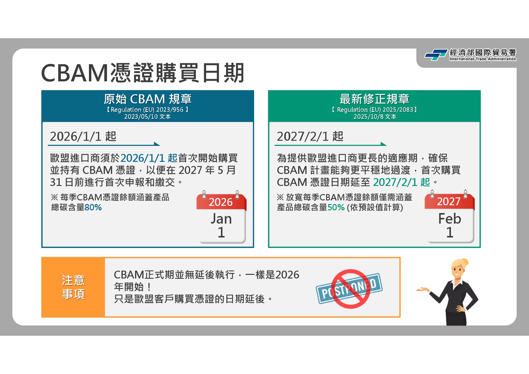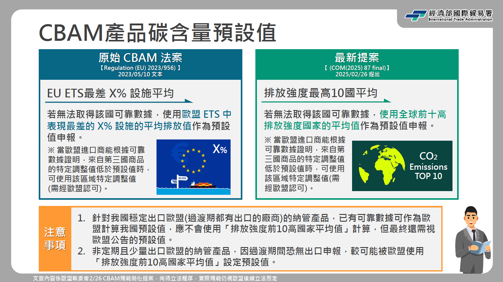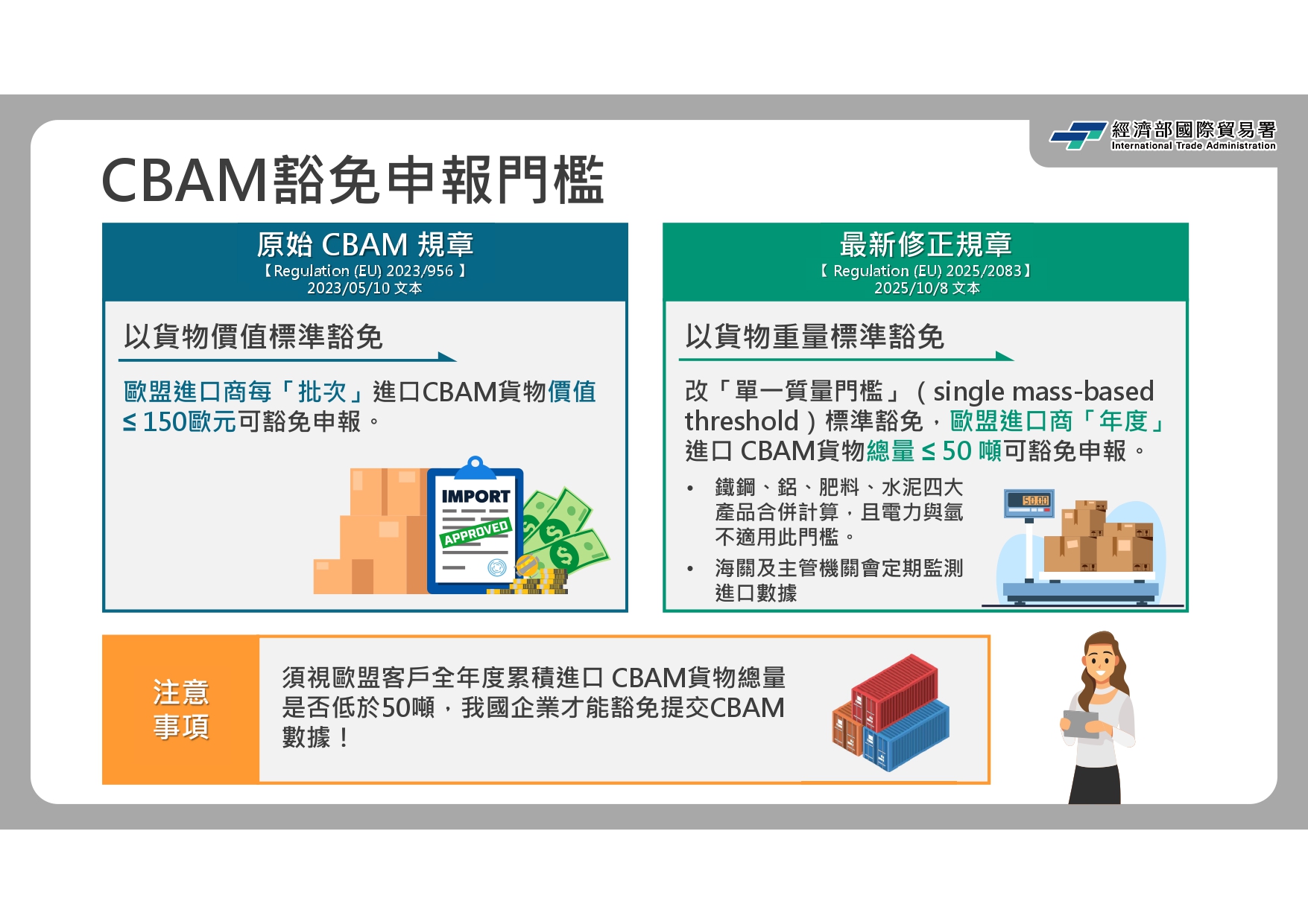 歐盟執委會於2025年2月26日提出之CBAM簡化草案重點,說明與原始法案差異,包括:將豁免門檻由「批次價值150歐元」調整為「年進口量50噸」、延後憑證購買及申報繳交時間、簡化部分製程排放計算、更新預設排放值與第三國碳價抵減機制等。