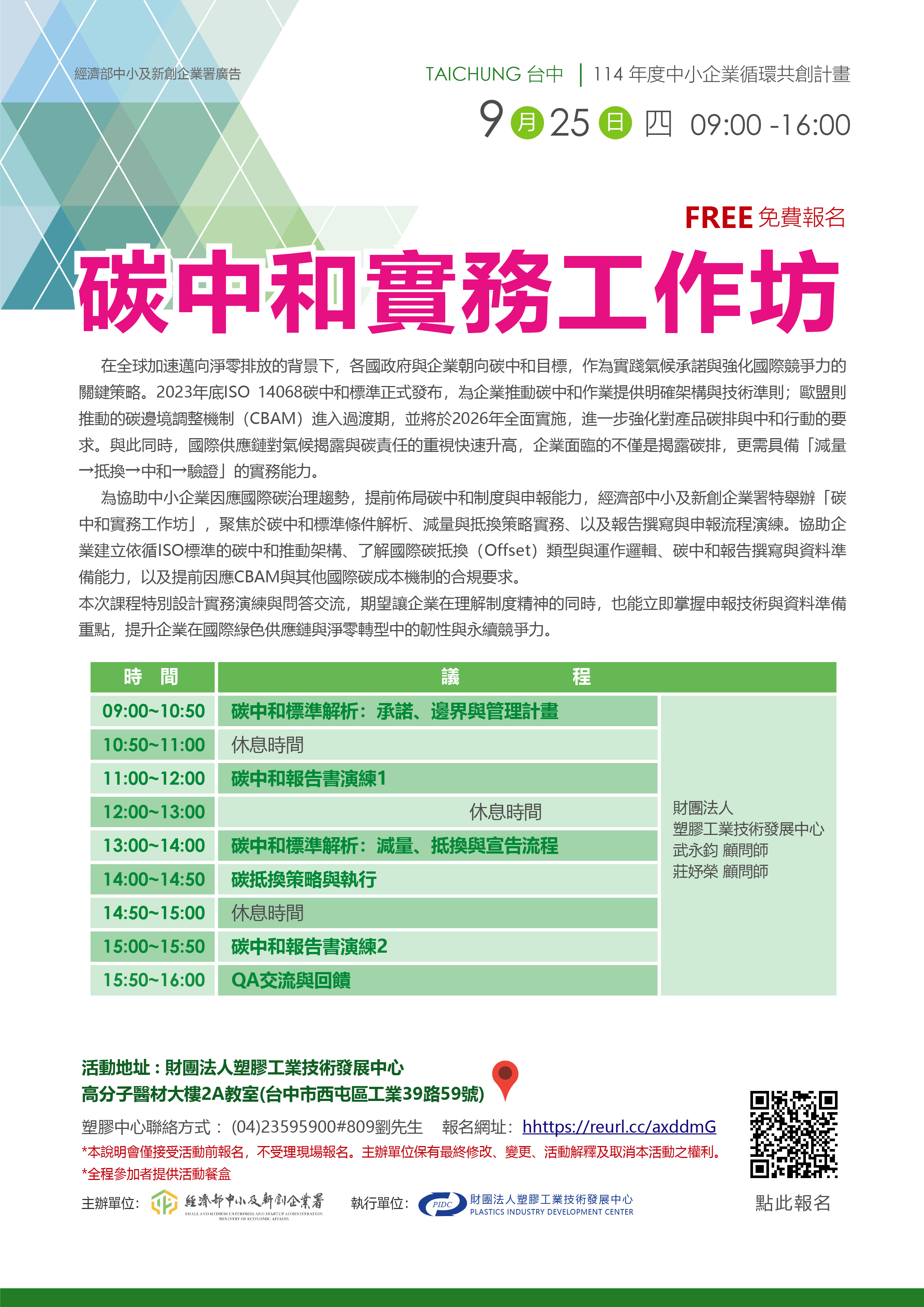 在全球加速邁向淨零的趨勢下,ISO 14068碳中和標準於2023年底發布,歐盟碳邊境調整機制(CBAM)也將於2026年全面實施,國際供應鏈對碳揭露與減碳要求日益嚴格,企業須具備「減量→抵換→中和→驗證」全流程能力。為協助中小企業提前佈局,經濟部中小及新創企業署舉辦「碳中和實務工作坊」,內容涵蓋碳中和標準解析、減量與抵換策略、報告撰寫與申報流程。課程將引導企業建立ISO架構的碳中和制度,掌握國際碳抵換類型與運作模式,熟悉資料準備與合規技巧,並透過實務演練與交流,協助強化國際競爭力與永續韌性。