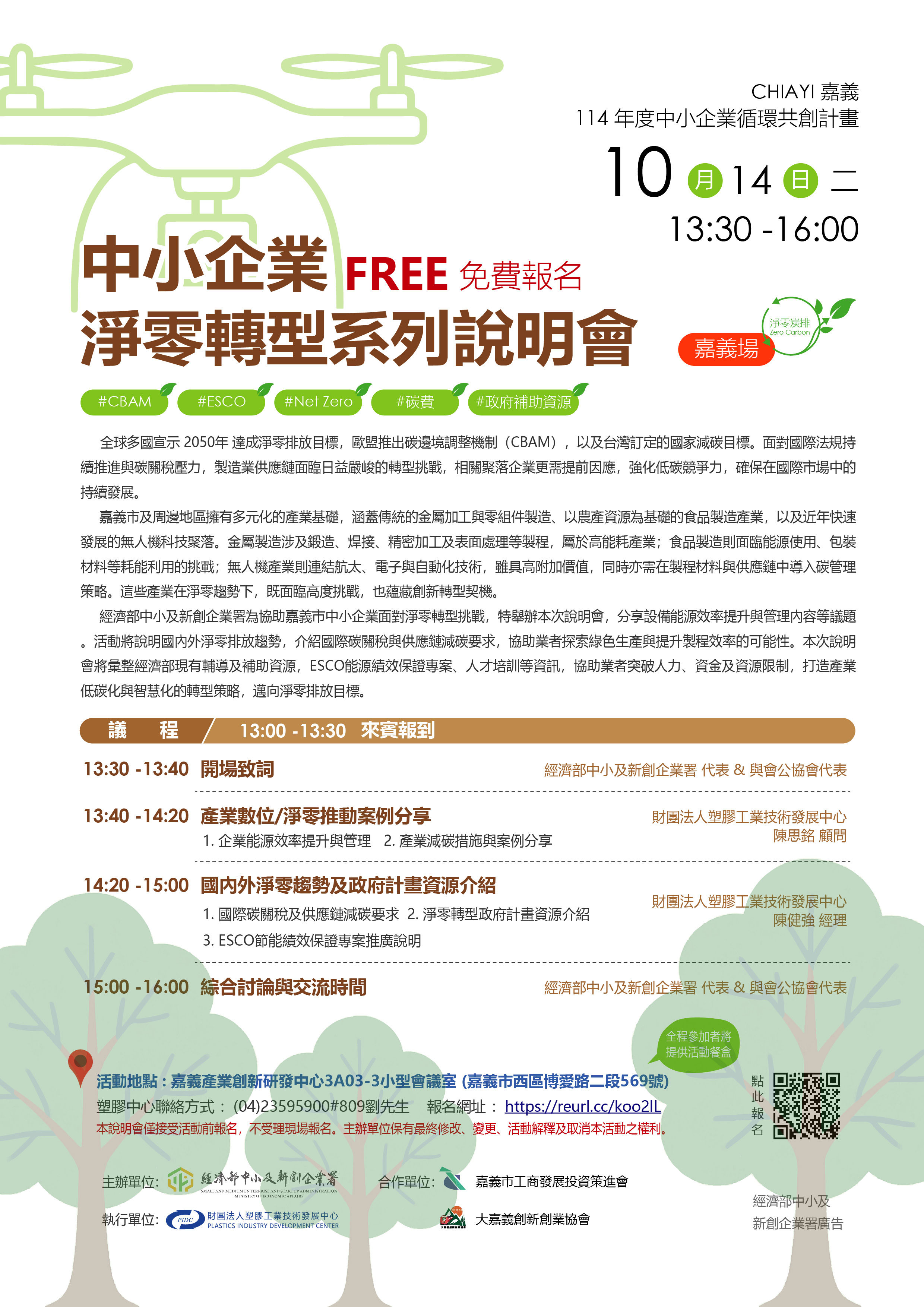 為協助業界在此關鍵時刻搶占淨零先機,我們誠摯邀請您參加「114年中小企業循環共創計畫 嘉義市 場次 - 中小企業淨零轉型系列說明會」