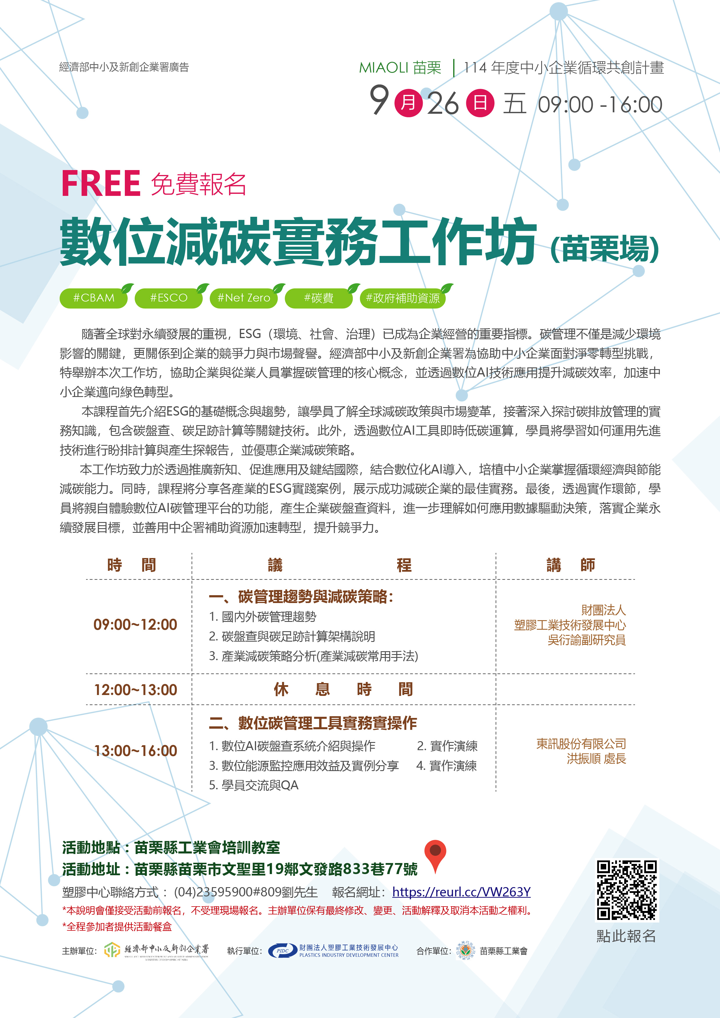 我們誠摯邀請您參加「數位減碳實務工作坊」苗栗縣