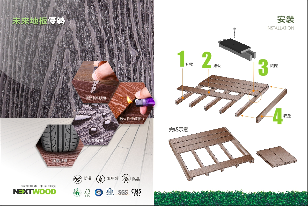 Less maintenance and non-toxic green building materials invented with mixture of recycled PE and wood fiber passed FSC certification, in replacement of traditional woodwork, and friendly to the forest.