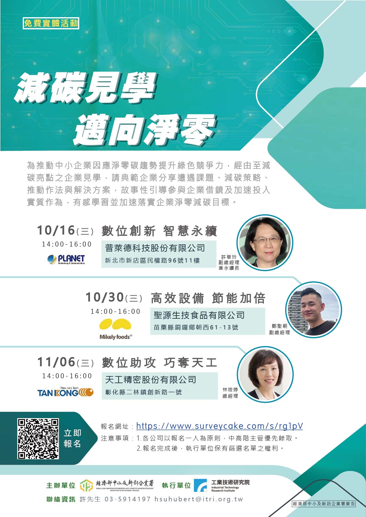 經濟部中小及新創企業署為了協助中小企業加速節能減碳,特別邀請減碳學習之典範企業,分享減碳策略、推動作法與解決方案,藉由實地參訪引導參與企業學習效仿,加速投入減碳作為以達成減碳目標。今年(113年)下半年最後三場企業減碳見學活動如下,期能帶動中小企業綠色轉型,以提升整體產業競爭力。活動均為免費,名額有限,請把握機會。