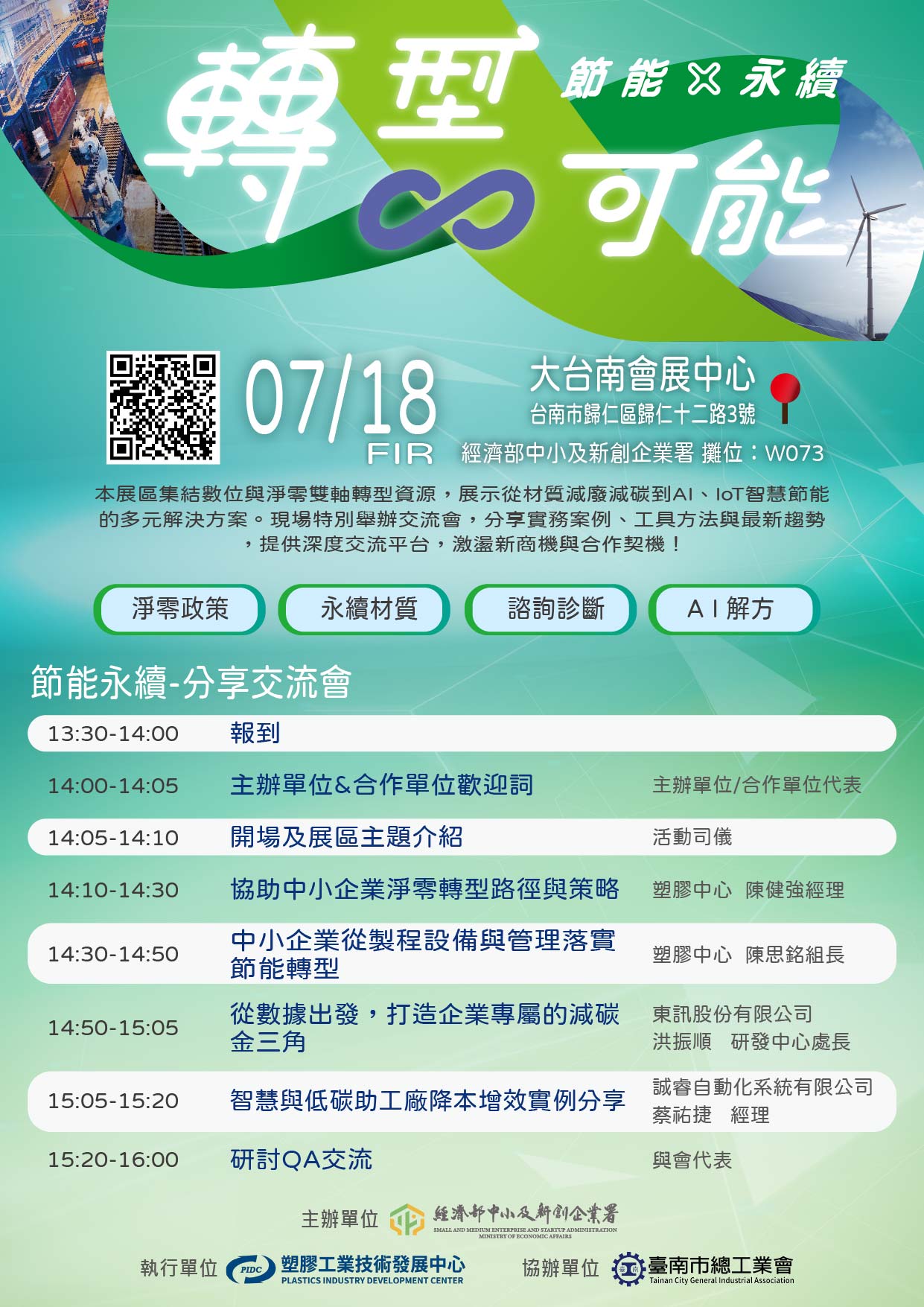 本交流會將於「南方人才永續展×節能智慧轉型」展中舉辦,請先完成展覽活動報名,再報名「節能永續分享交流會」。當天須出示展覽QRCode入場,並至活動攤位 W073 報到,感謝配合!