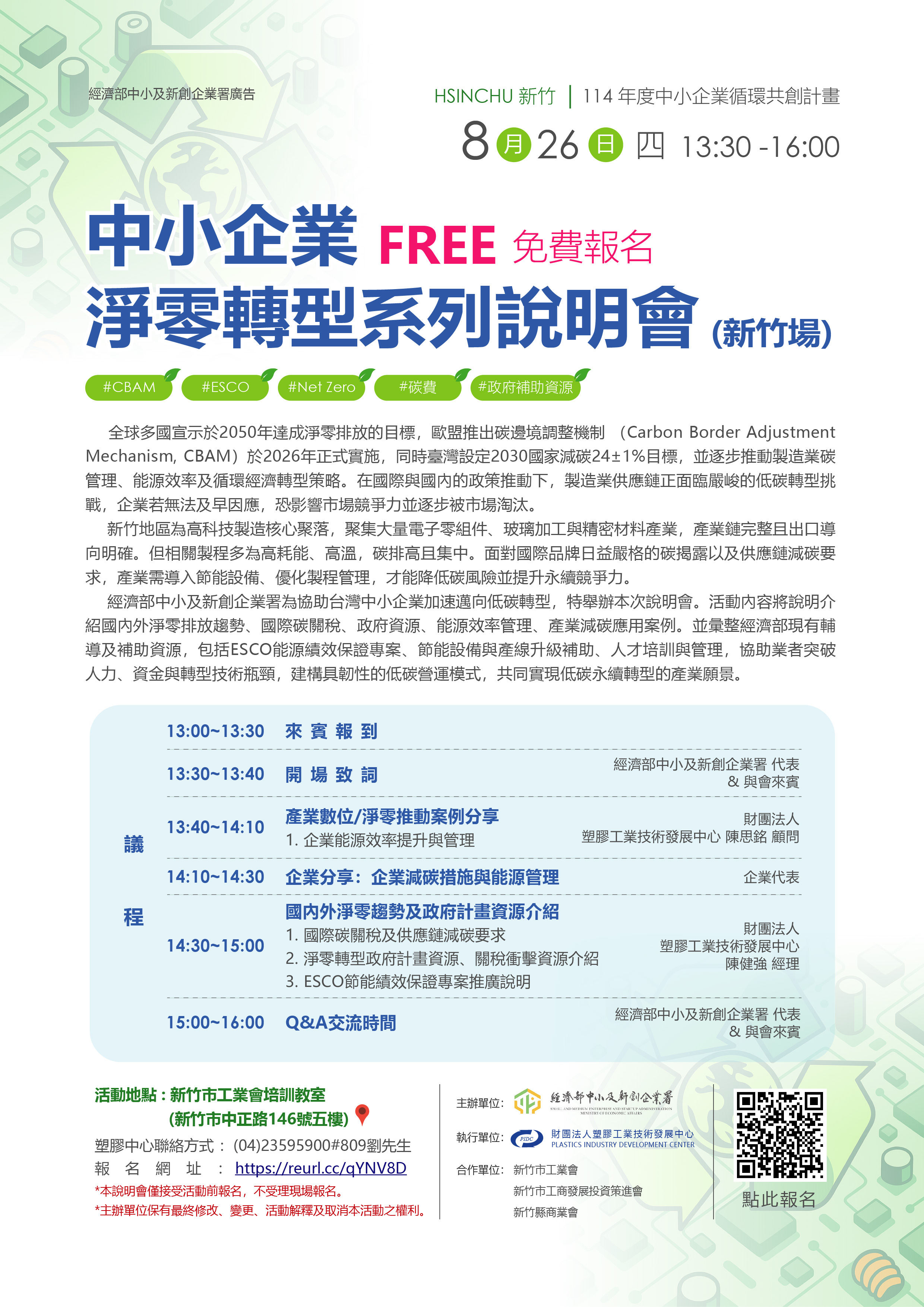 為協助業界在此關鍵時刻搶占淨零先機,我們誠摯邀請您參加「114年中小企業循環共創計畫 新竹市場次 - 中小企業淨零轉型系列說明會」