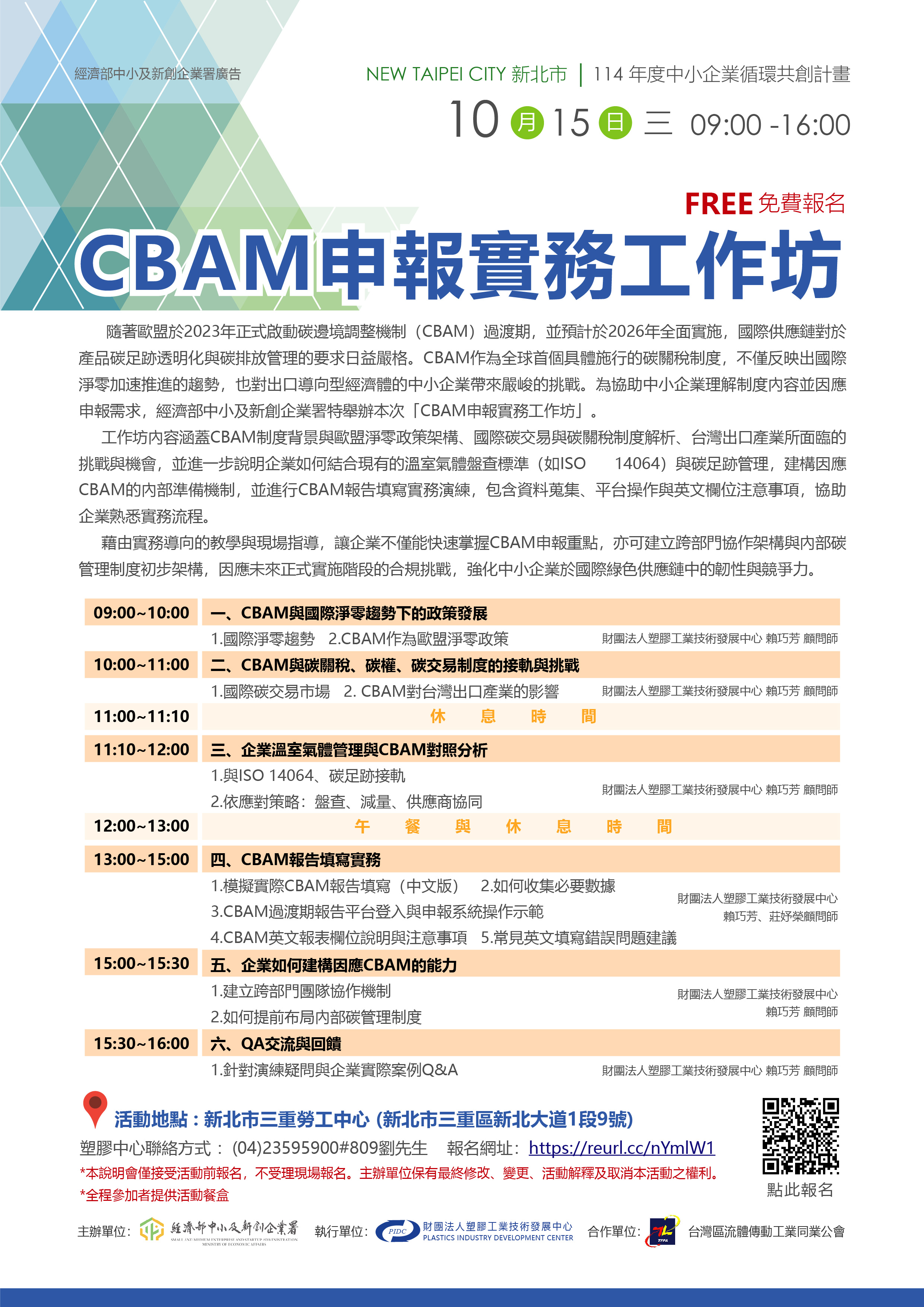 為協助業界在了解CBAM申報流程,我們誠摯邀請您參加「CBAM申報實務工作坊」新北場