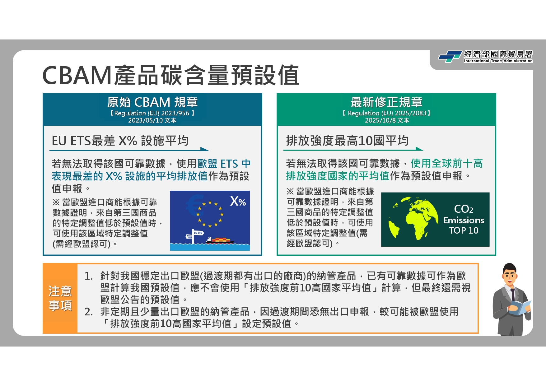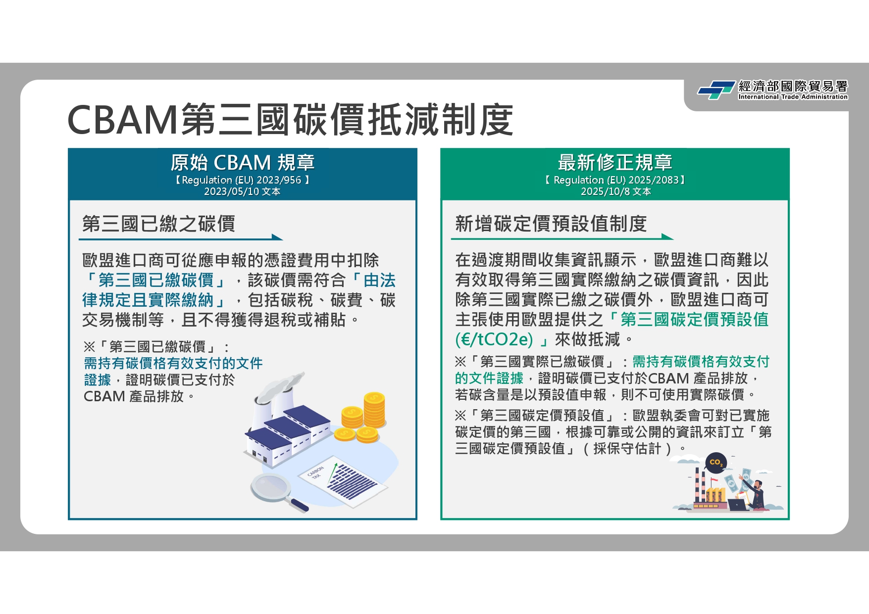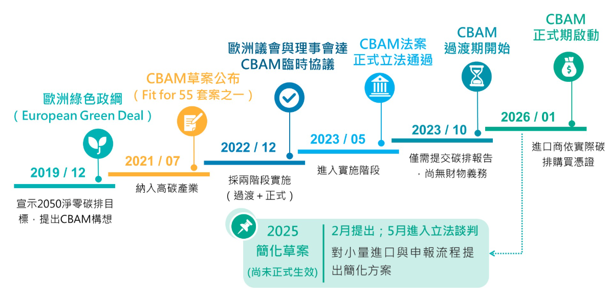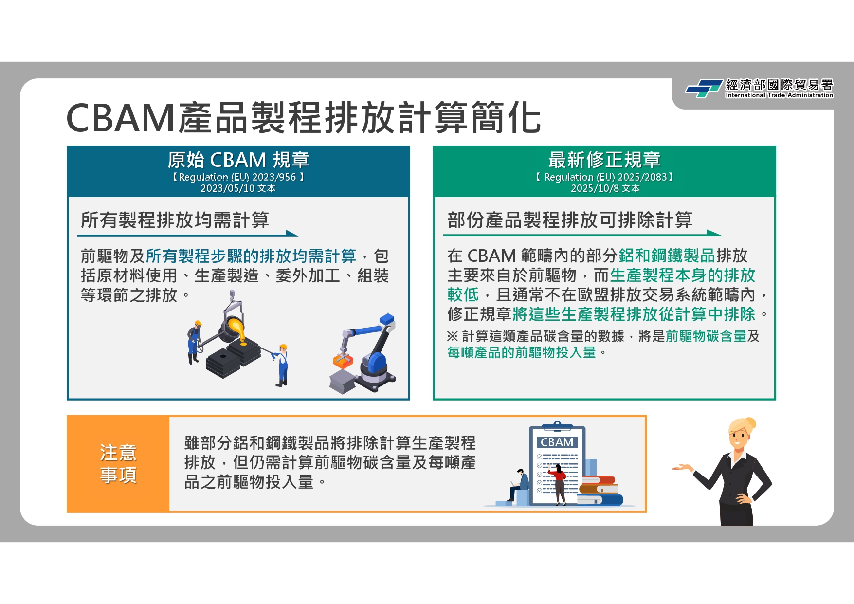 歐盟執委會於2025年2月26日提出之CBAM簡化草案重點,說明與原始法案差異,包括:將豁免門檻由「批次價值150歐元」調整為「年進口量50噸」、延後憑證購買及申報繳交時間、簡化部分製程排放計算、更新預設排放值與第三國碳價抵減機制等。