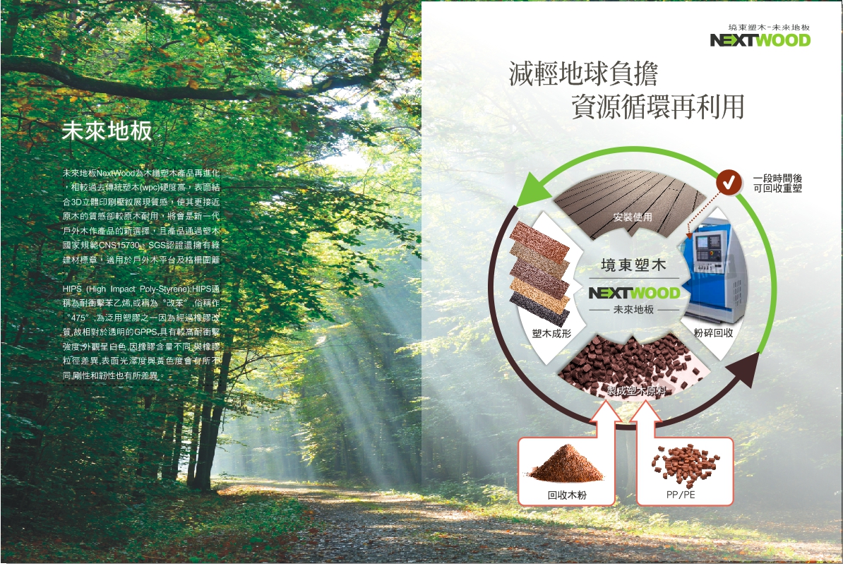 Less maintenance and non-toxic green building materials invented with mixture of recycled PE and wood fiber passed FSC certification, in replacement of traditional woodwork, and friendly to the forest.