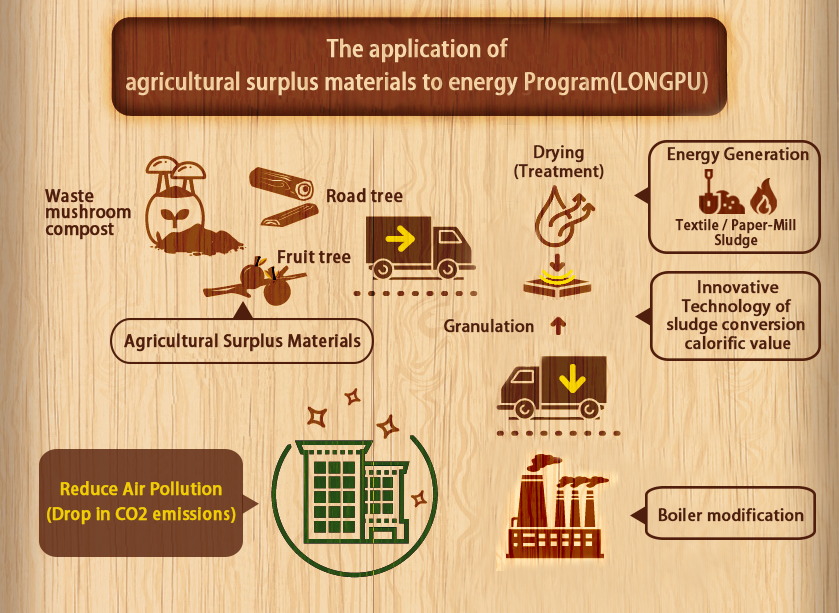 為解決菇農太空包丟置處理問題,將菇類太空包培養基(木屑)開發成為「木顆粒」,成為生質燃料可應用於蒸氣鍋爐輔助燃料之一,除可有效提供現今社會所需能源,並提高資源可再利用之永續性。