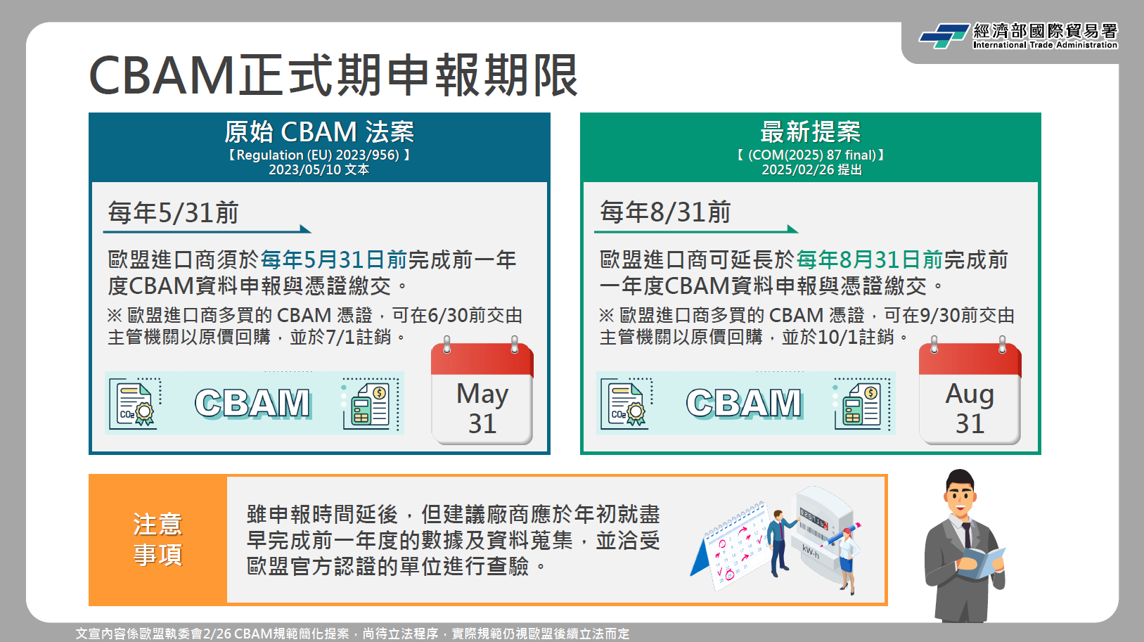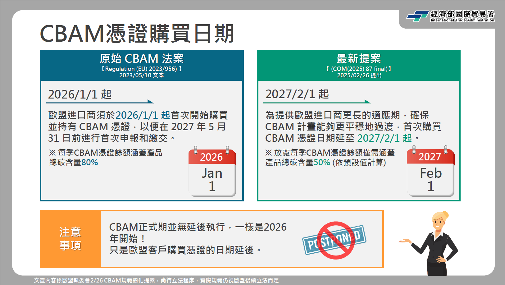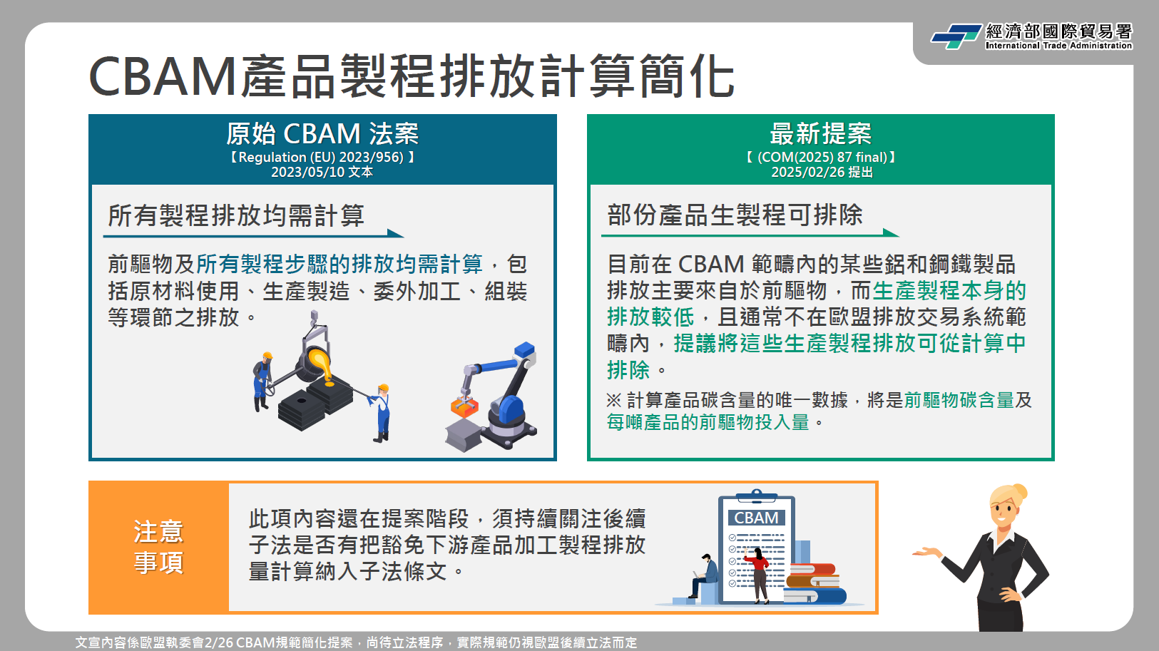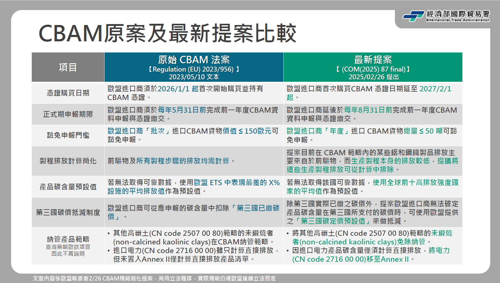 歐盟執委會於2025年2月26日提出之CBAM簡化草案重點,說明與原始法案差異,包括:將豁免門檻由「批次價值150歐元」調整為「年進口量50噸」、延後憑證購買及申報繳交時間、簡化部分製程排放計算、更新預設排放值與第三國碳價抵減機制等。