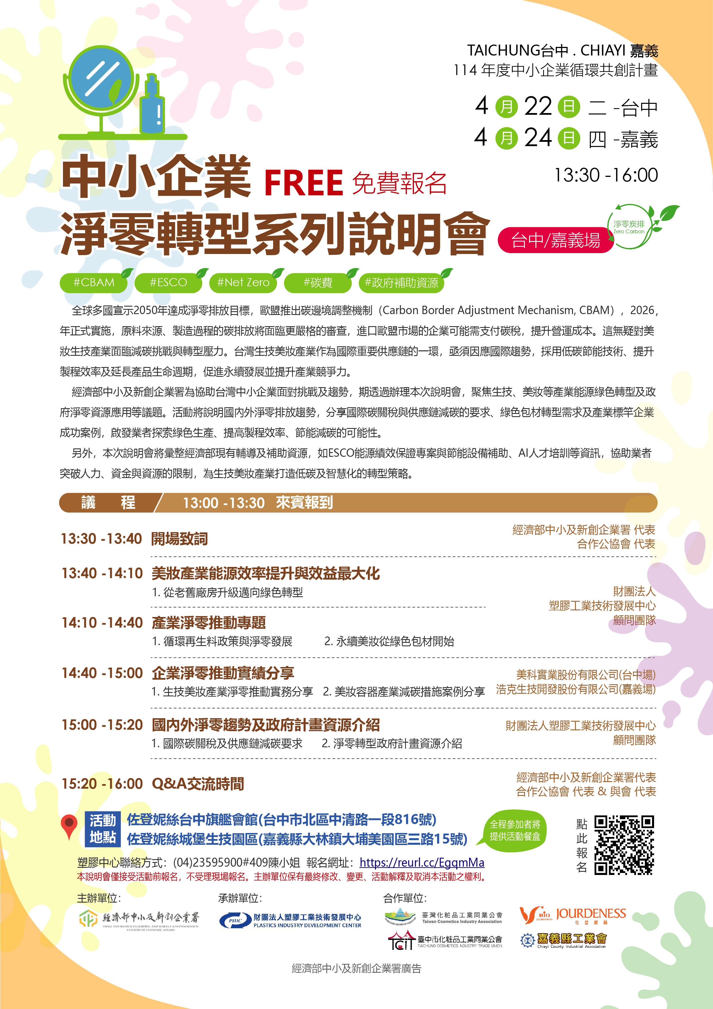 為協助業界在此關鍵時刻搶占淨零先機,我們誠摯邀請您參加「114年中小企業循環共創計畫 苗栗場 - 中小企業淨零轉型系列說明會」