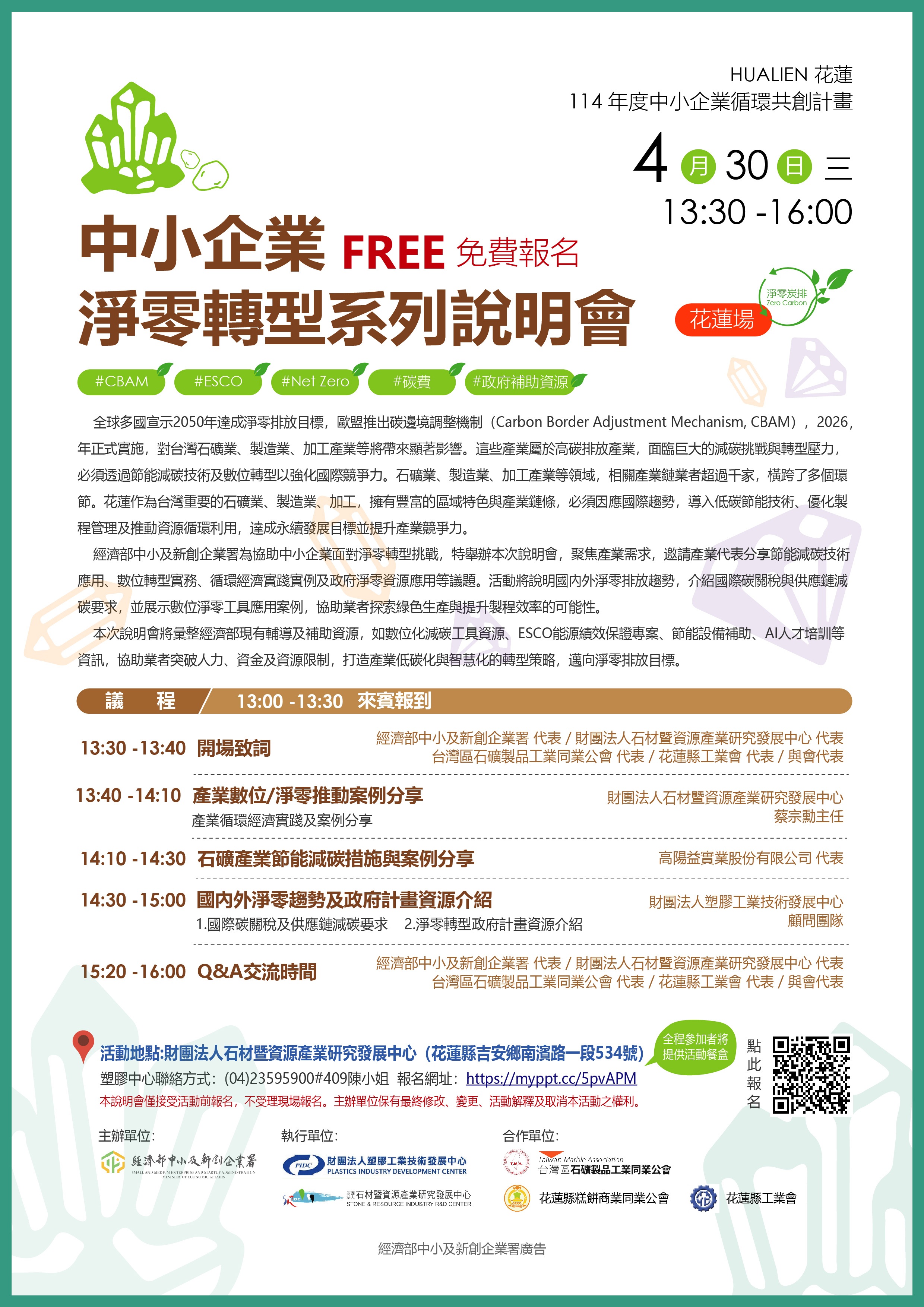 為協助業界在此關鍵時刻搶占淨零先機,我們誠摯邀請您參加「114年中小企業循環共創計畫 苗栗場 - 中小企業淨零轉型系列說明會」