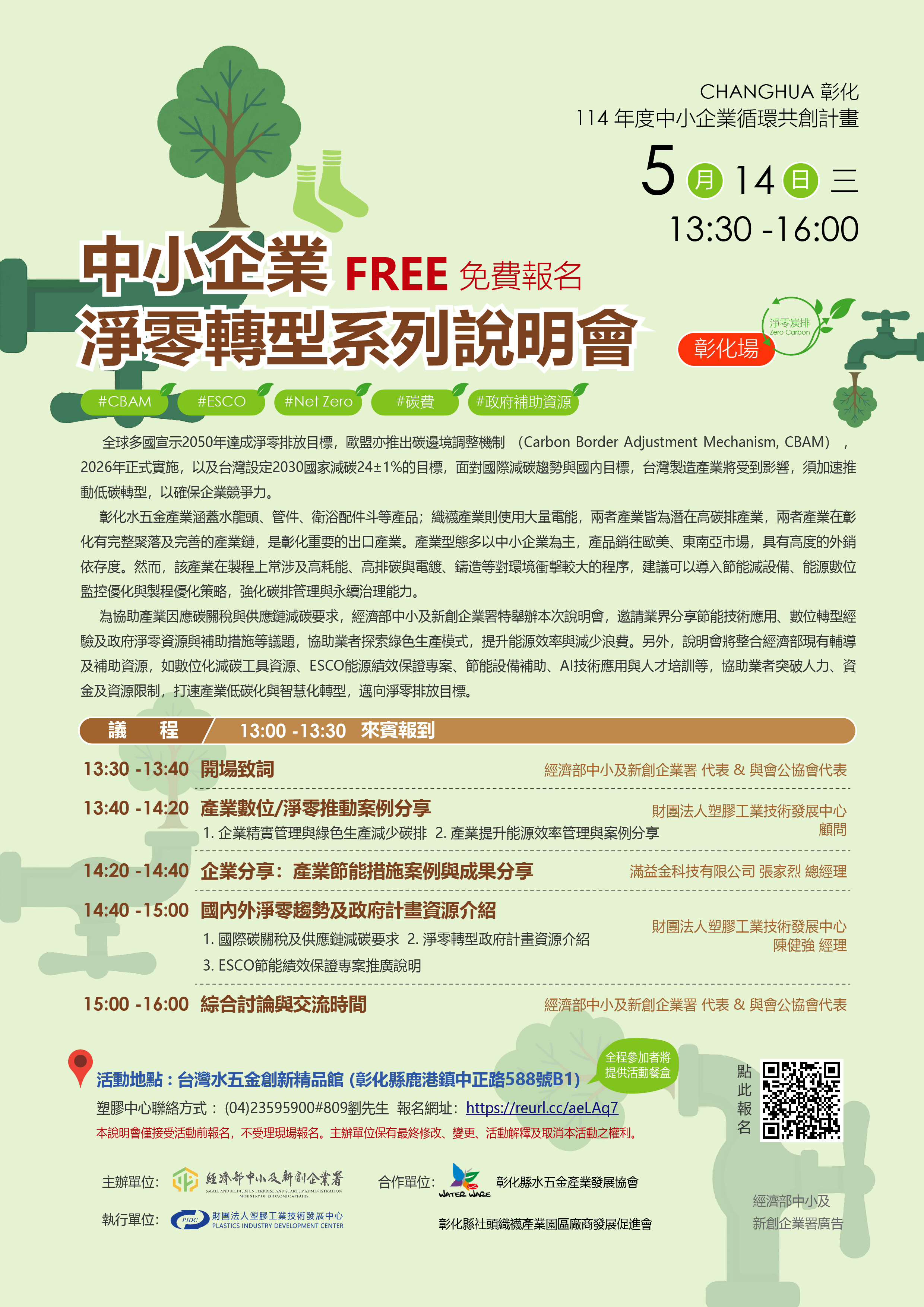 為協助業界在此關鍵時刻搶占淨零先機,我們誠摯邀請您參加「114年中小企業循環共創計畫 彰化場 - 中小企業淨零轉型系列說明會」