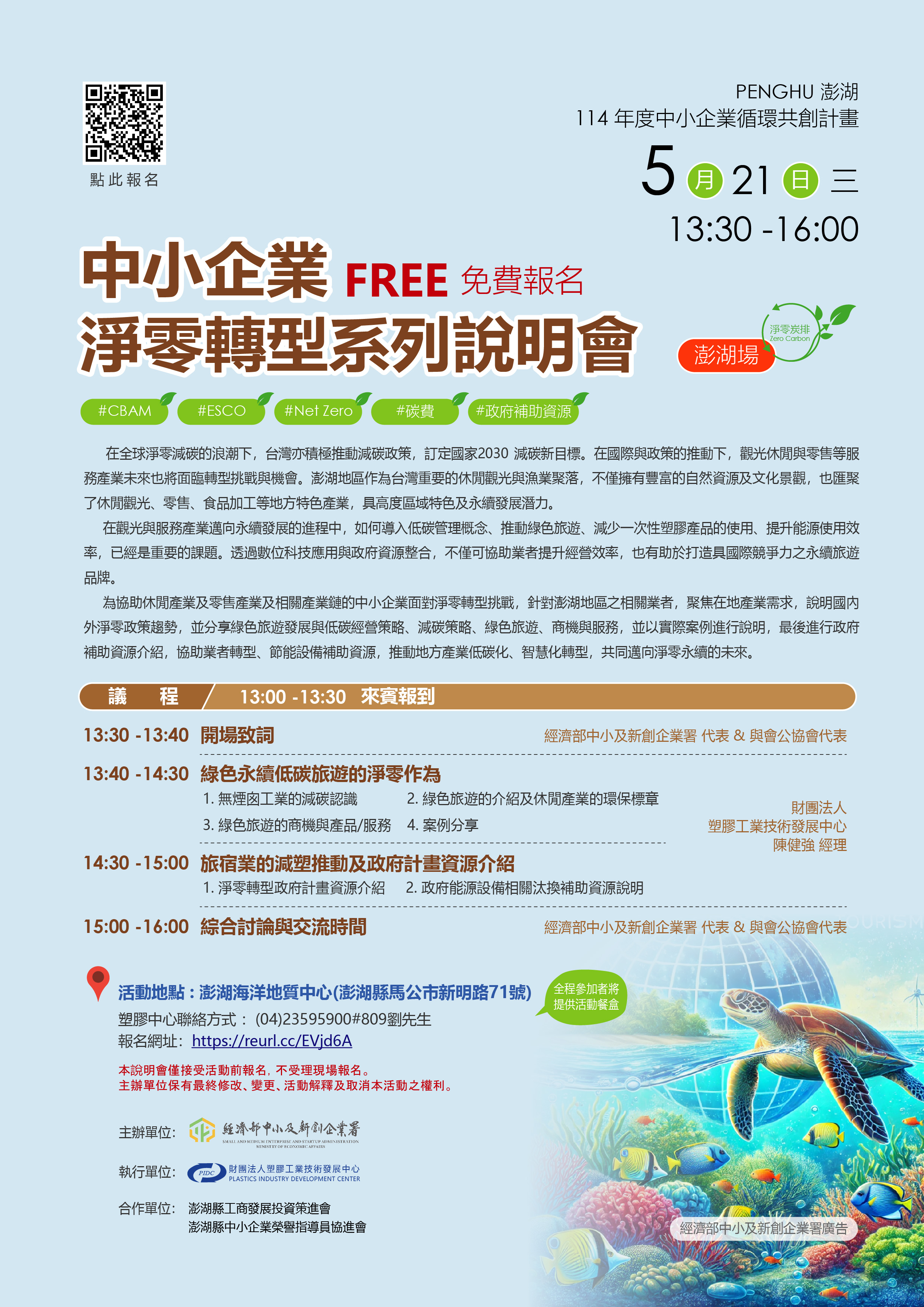 為協助業界在此關鍵時刻搶占淨零先機,我們誠摯邀請您參加「114年中小企業循環共創計畫 澎湖場 - 中小企業淨零轉型系列說明會」