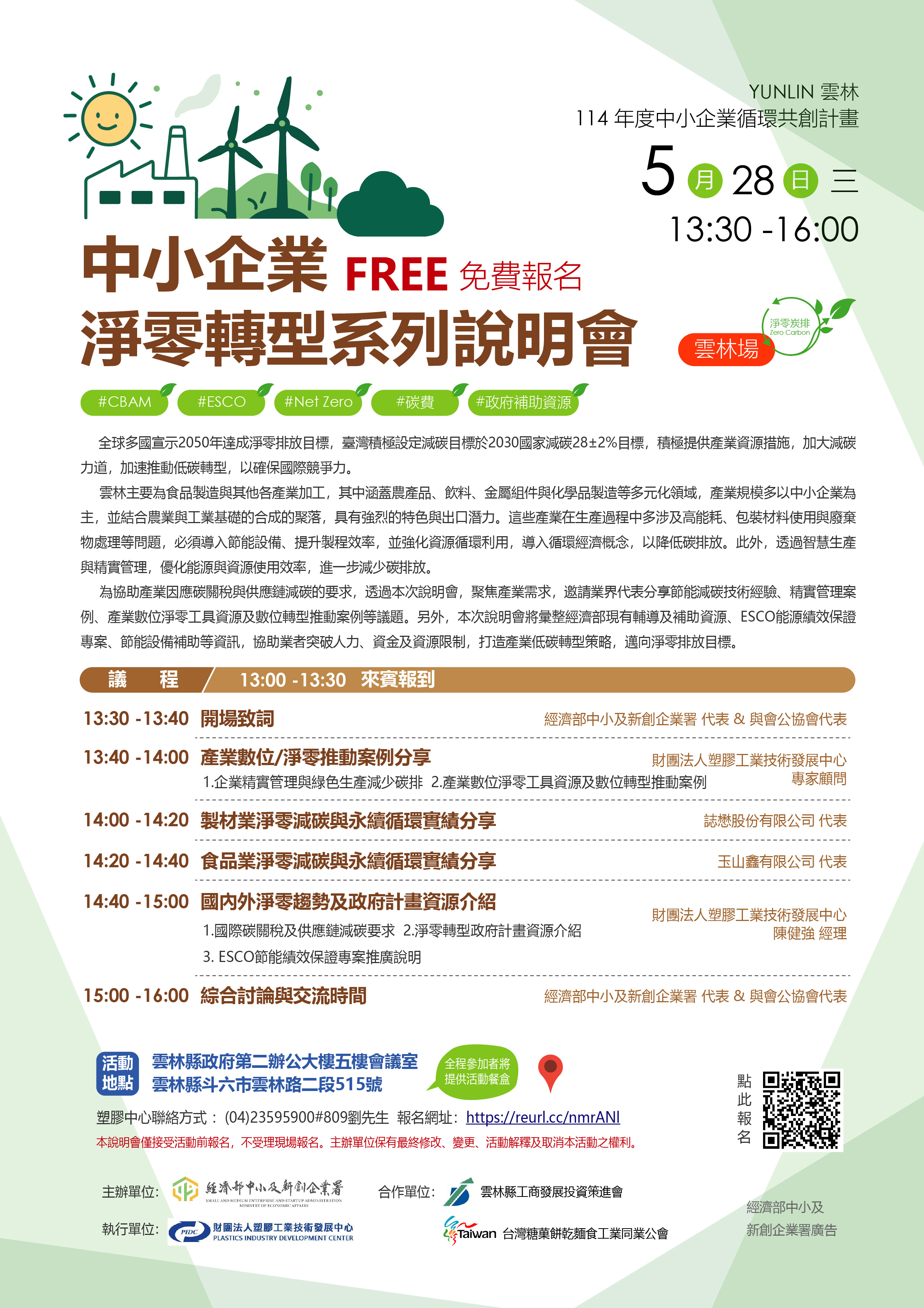 為協助業界在此關鍵時刻搶占淨零先機,我們誠摯邀請您參加「114年中小企業循環共創計畫 雲林場 - 中小企業淨零轉型系列說明會」