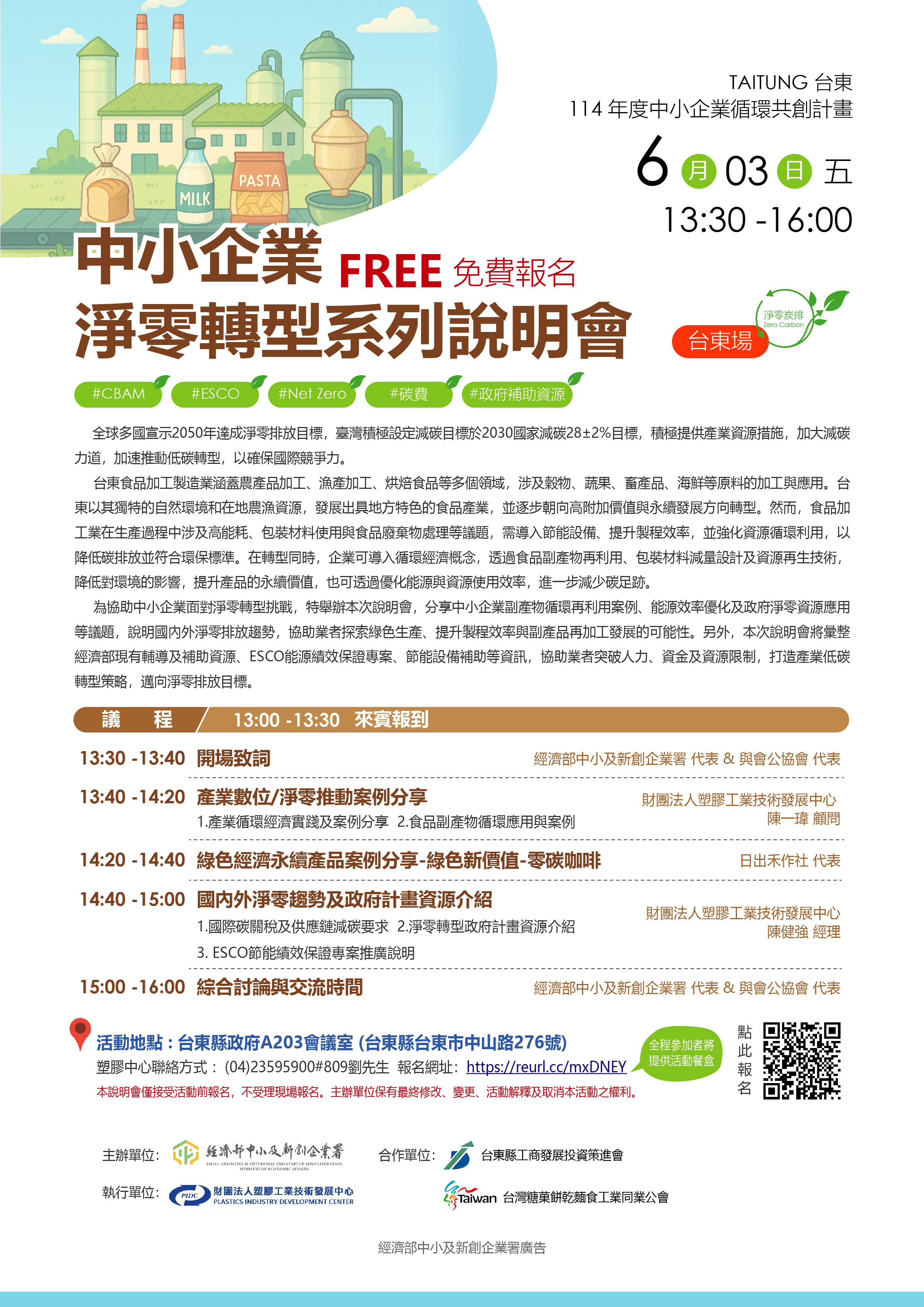 為協助業界在此關鍵時刻搶占淨零先機,我們誠摯邀請您參加「114年中小企業循環共創計畫 台東場 - 中小企業淨零轉型系列說明會」