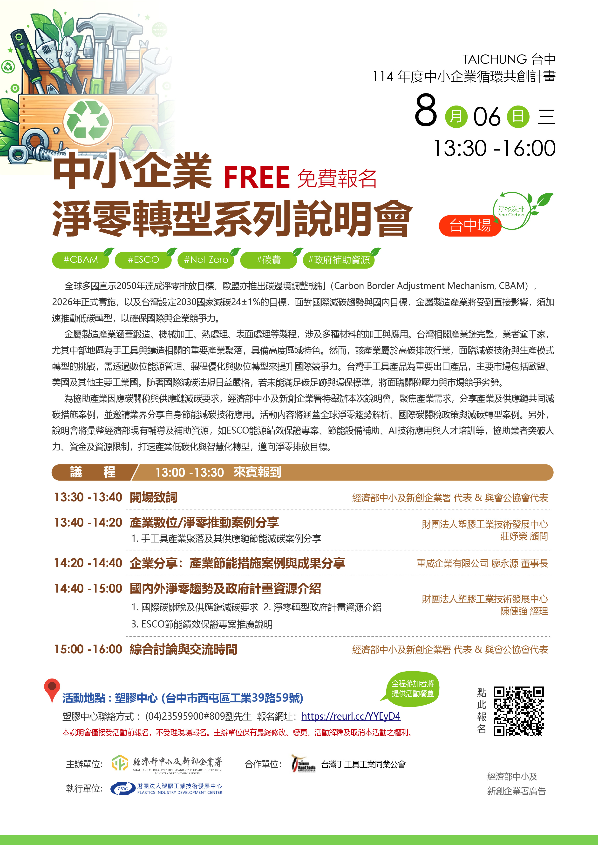 為協助業界在此關鍵時刻搶占淨零先機,我們誠摯邀請您參加「114年中小企業循環共創計畫 台中場 - 中小企業淨零轉型系列說明會」