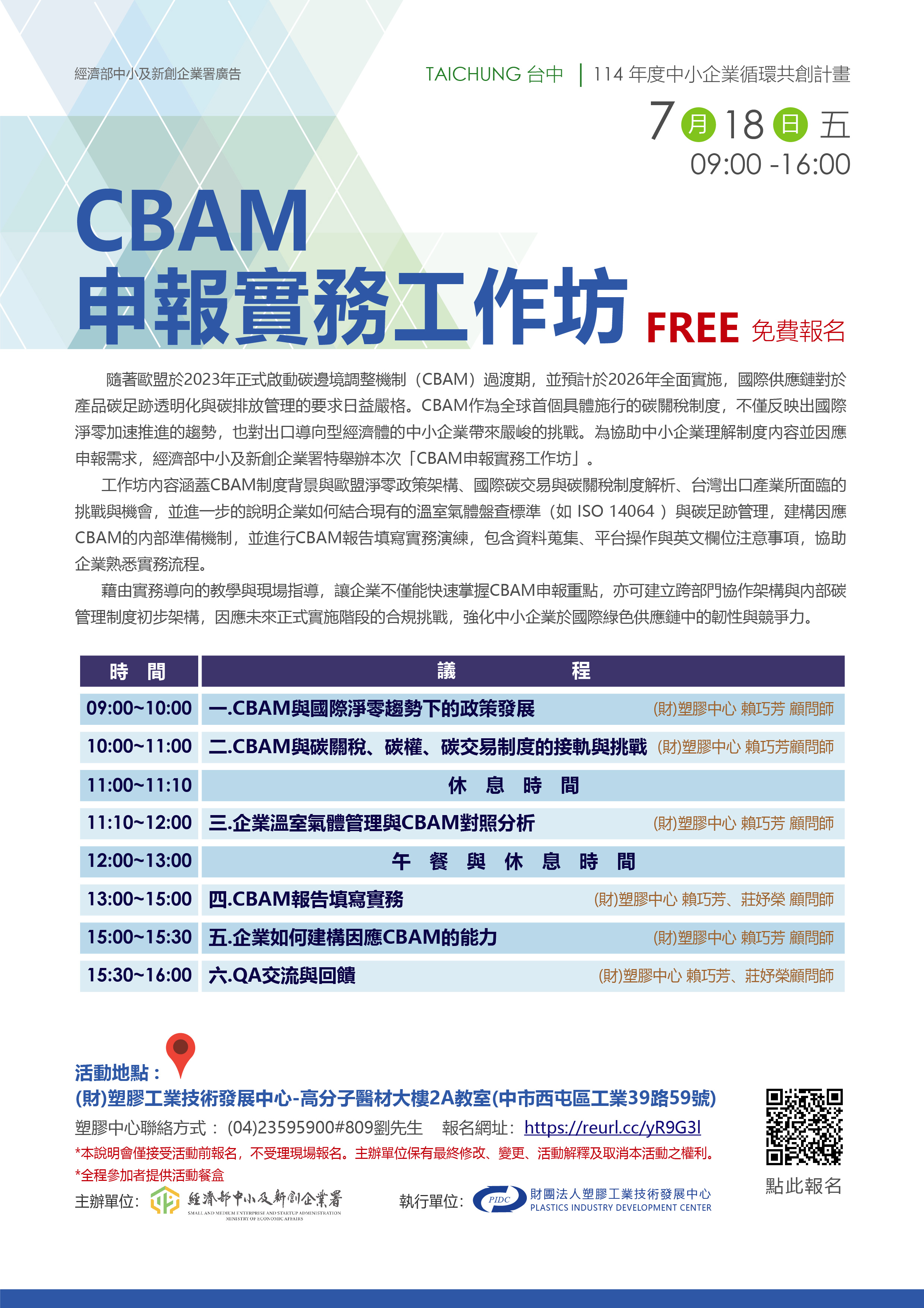 為協助業界在了解CBAM申報流程,我們誠摯邀請您參加「CBAM申報實務工作坊」台中場