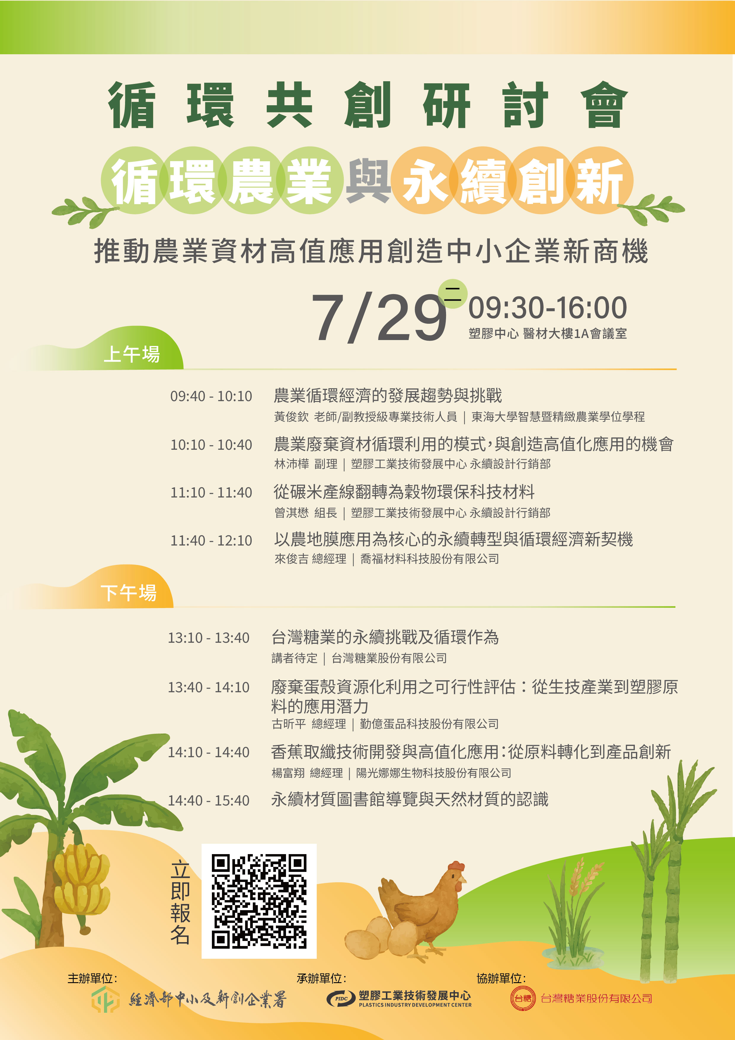 本次研討會聚焦於兩大主軸:循環農業模式與實務案例及農業廢棄物的高值化應用,廣邀來自產、學、研各界的專家與企業代表共襄盛舉。會中將分享中小企業針對農業循環與技術應用經驗,邀請對農業永續發展、農業資材處理與循環經濟的企業共同前來交流,進一步促成跨產業的媒合與創新。