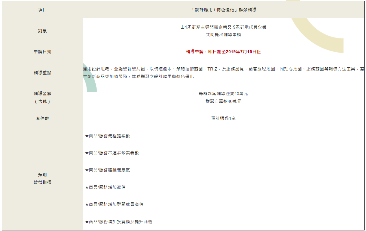 為協助中小企業體驗創新、升級轉型,提升產業競爭力,實踐以「人」為核心的「優化顧客體驗情境」與「創造商品設計加值」,發展多型態的思維設計模組、服務情境創新樣貌,特辦本計畫開放企業申請「設計應用或特色優化群聚輔導」,以厚植中小企業創新體驗力,優化中小企業體驗經濟力。