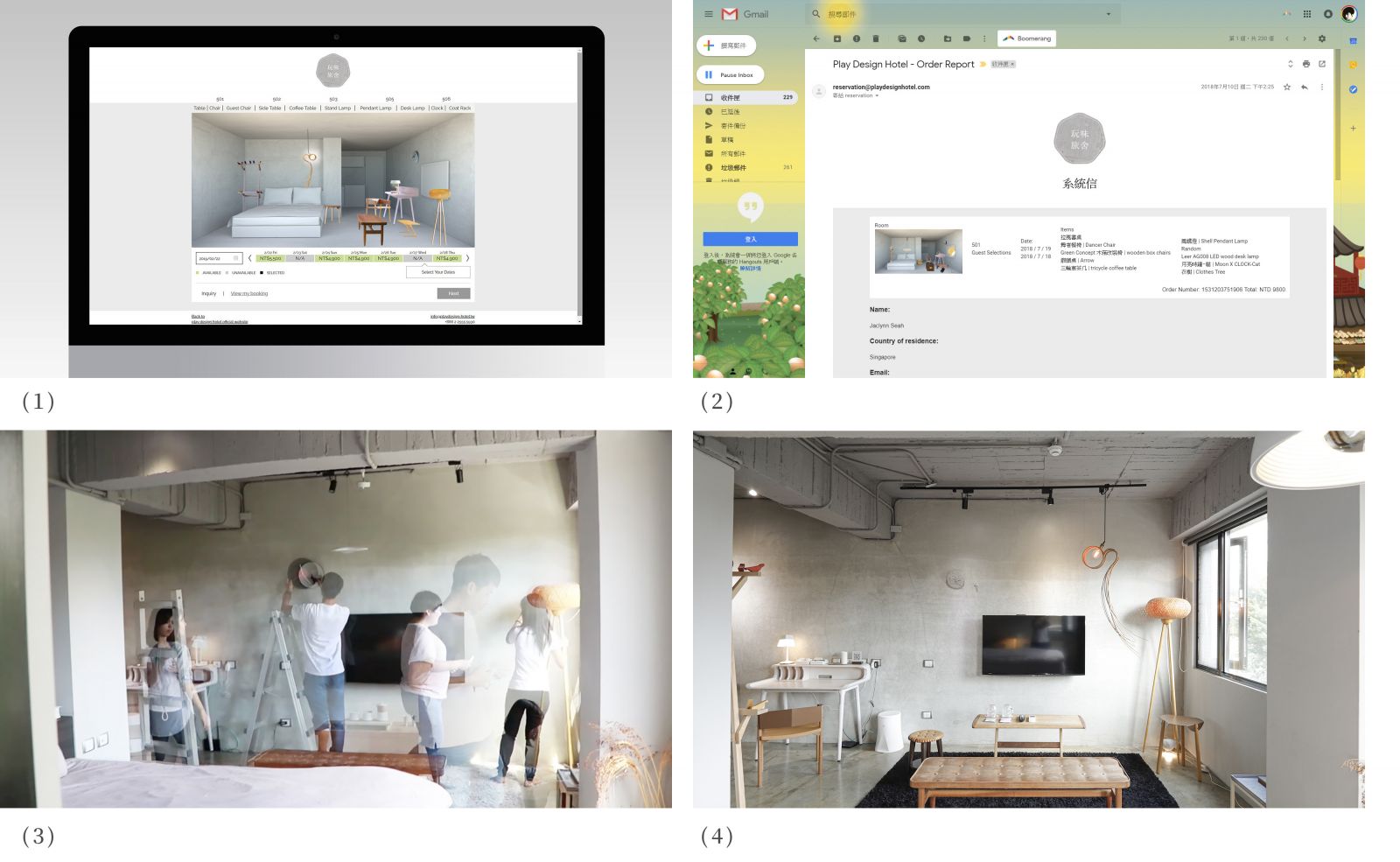 (1)「顧客選品房 Guest Selection Room」訂房介面;(2)前台服務人員收到的訂單夾帶客人選的家具及擺件;