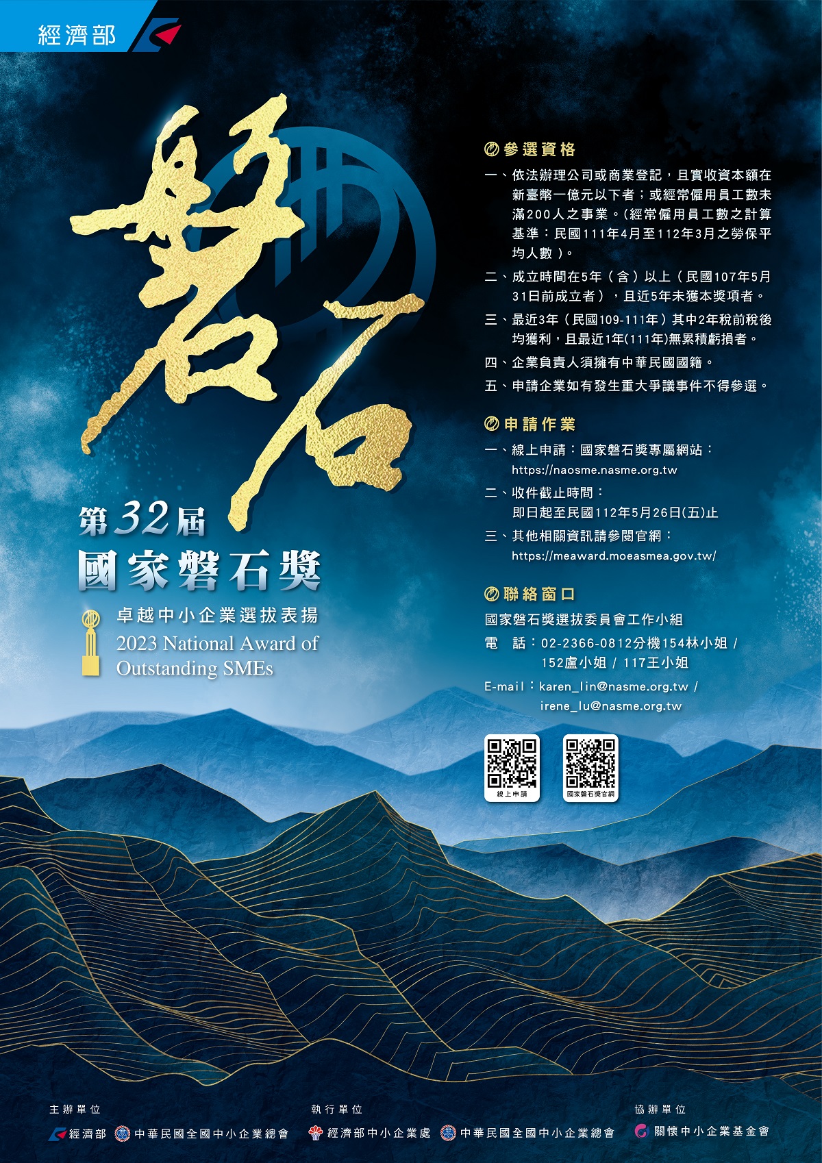 自本(112)年即日起至5月26(五)日止受理報名,歡迎各界踴躍推薦卓越之中小企業參選。參選企業可藉由獎項申請由實訪階段專家學者檢視自身的經營發展狀況外,獲獎後更可進一步提升企業商譽,同時也利於擴展海內外市場,開創經營的新契機,對提升公司整體營運有很大助益。