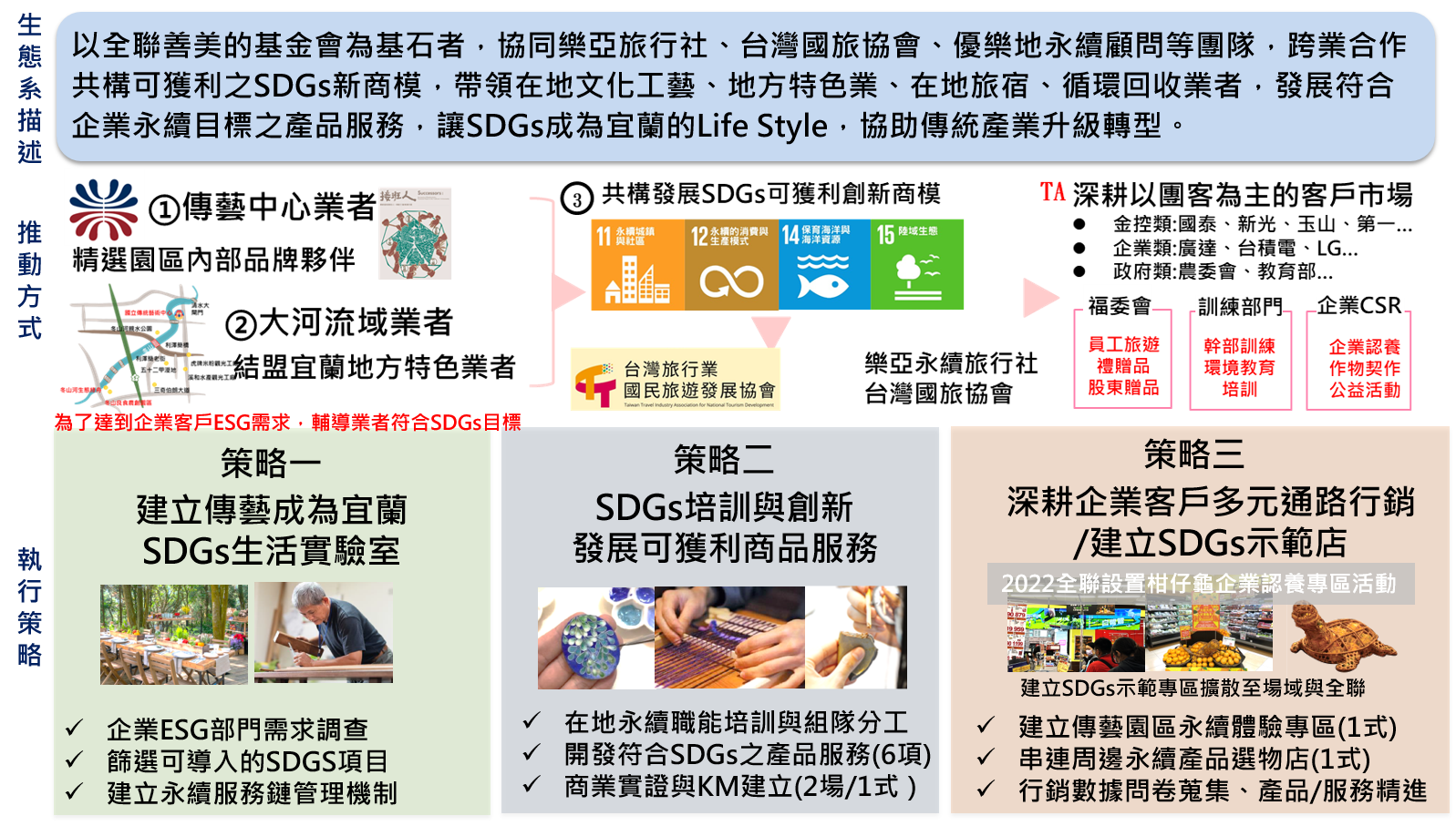 以全聯善美的基金會為基石者,協同樂亞旅行社、台灣國旅協會、優樂地永續顧問等團隊,跨業合作共構可獲利之SDGs新商模,帶領在地文化工藝、地方特色業、在地旅宿、循環回收業者,發展符合企業永續目標之產品服務,讓SDGs成為宜蘭的Life Style,協助傳統產業升級轉型。