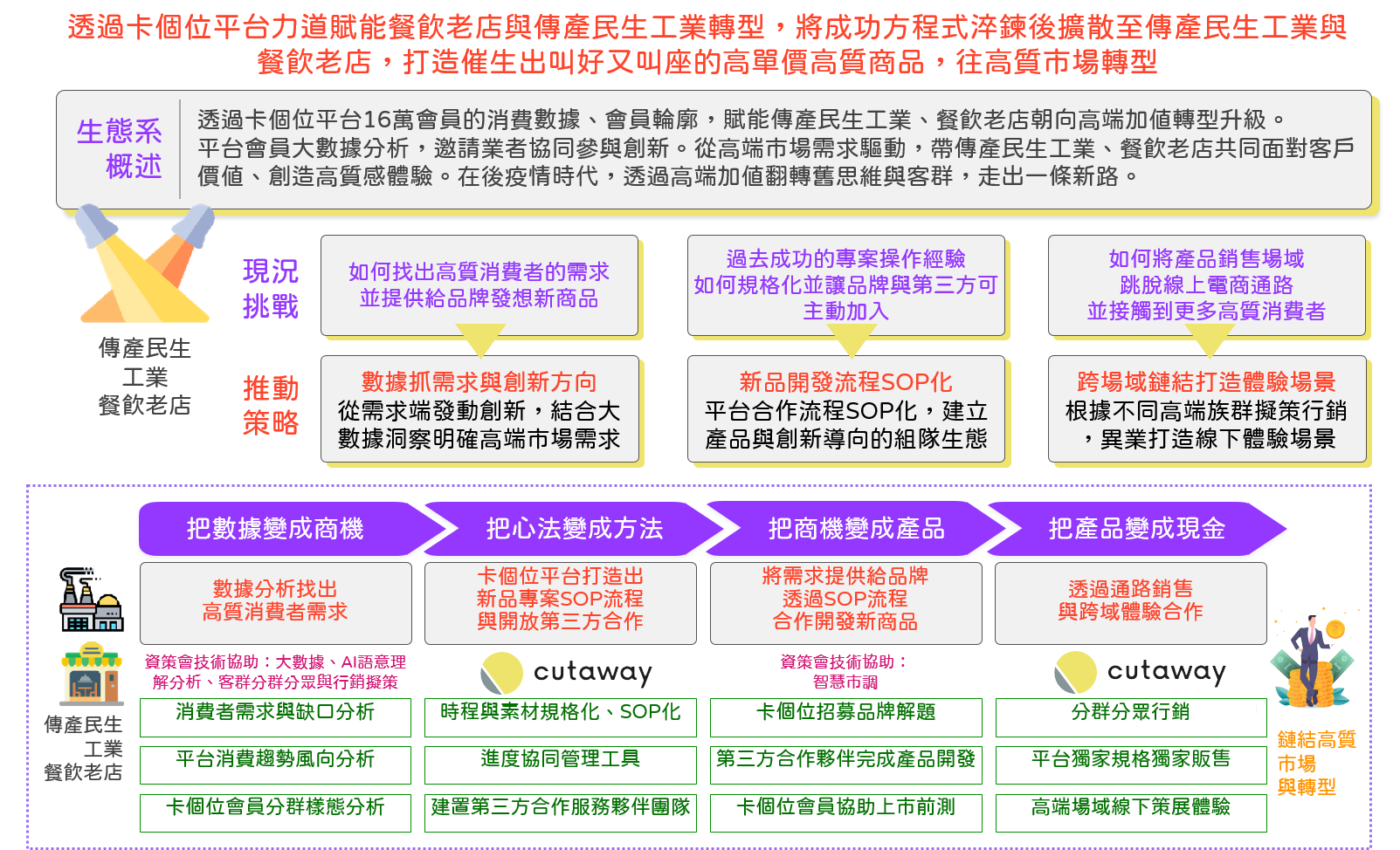 平台賦能品牌高質化轉型服務生態系聚焦在疫情日常化後經濟逐步走向復甦,而在疫情受到重創的傳產民生工業與餐飲業者在疫情期間紛紛倒閉,復甦後加遽業者轉型變革的需求與決心。但環境變了、消費者也變了。以往從未經歷過的兩年疫情,讓許多人學會縮衣節食,普羅消費者心態愈趨理性,追求性價比,比以往更在乎效用與價值。傳產民生工業與餐飲老店面對環境趨勢與消費行為改變,如何轉型?並非大眾所認知的淺層改做電商或搞數位行銷就等於轉型。平台賦能品牌高質化轉型服務生態系透過卡個位平台力道賦能餐飲老店與傳產民生工業轉型,將成功方程式淬鍊後擴散至傳產民生工業與餐飲老店,打造催生出叫好又叫座的高單價高質商品,往高質市場轉型。