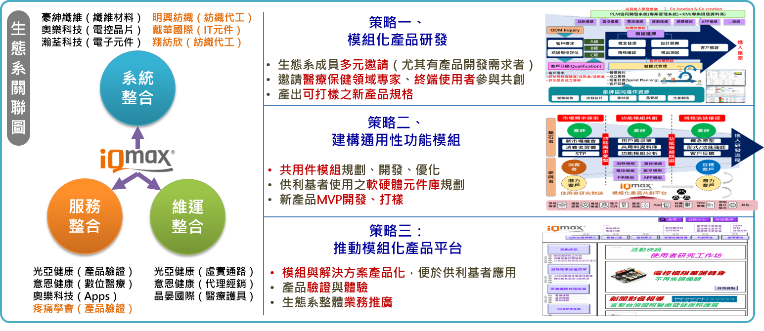 透過打造居家理療保健紡織產品一站式服務平台,匯聚紡織、電子、資通訊、醫療保健、產品零售等多元產業,打造應用服務生態系,提供系統整合(軟硬體解決方案)、服務整合(設計/驗證)、維運整合(售後/客服)三大服務,滿足有新產品開發需求之品牌商/通路商/傳統輔具業者之「縮短研發時程」、「洞察用戶新需求」、「降低研發成本」需求;並透過材料與服務品牌iQmax,整合生態系成員共同接單、共同行銷、研發共創,攻略智慧紡織新市場