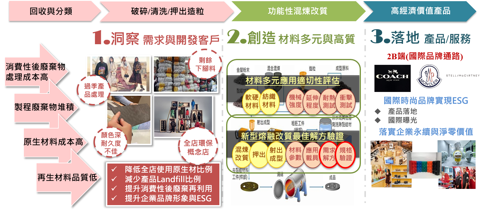 •窗口:工研院近年來環保議題受世界矚目,國際品牌紛紛要求供應鏈使用再生材料以發展永續經濟。本計畫以複合材料商邦泰公司及國際品牌出海口端午洋公司為雙基石者,鎖定品牌需求以高比例循環材料實現ESG,將串聯前處理、射出加工、異質複合材、設計等廠商,共創開發永續複合新料與高值產品,打入國際品牌通路(2B端)。基石者:邦泰複合材料、午洋公司