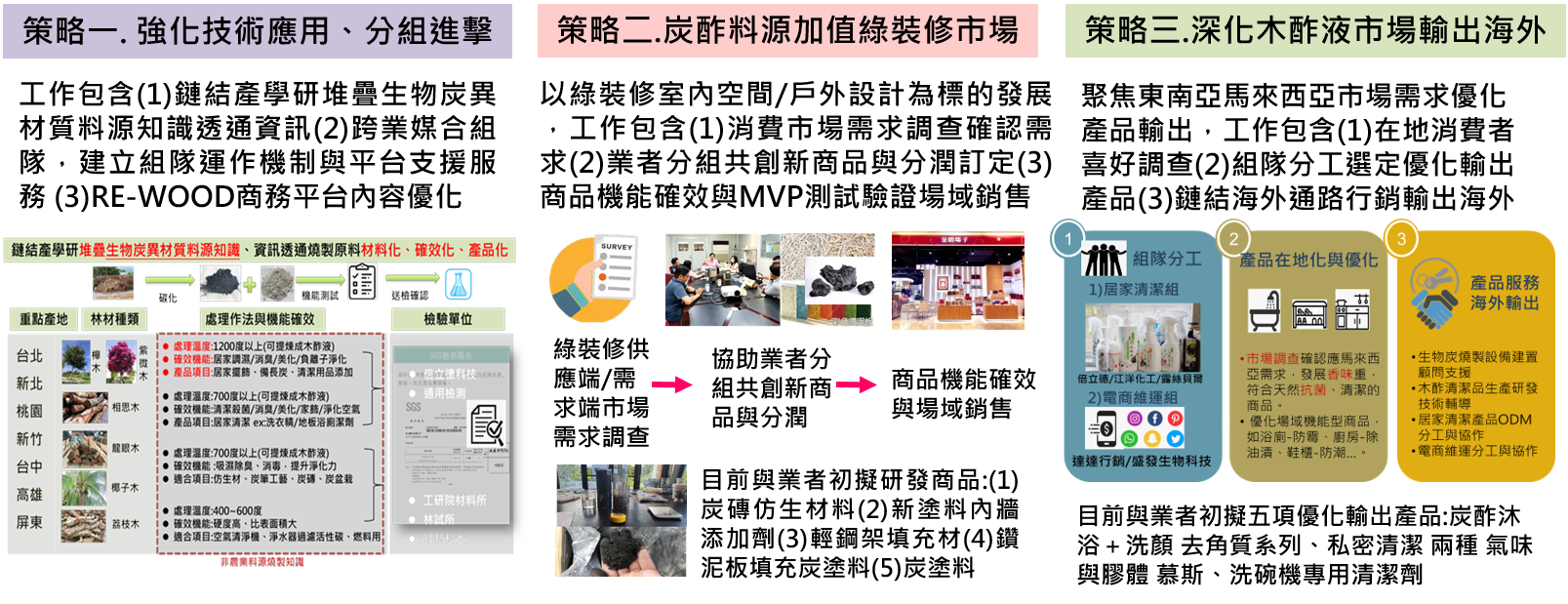 •窗口:資策會由盛發生物科技擔任基石者,協同亮宇國際、倍立德科技、工研院、中菱建材等產學研團隊合作,串聯生物炭與木酢液加工製造業者,加值國內林木剩餘資材與農業廢棄物資源,以生物炭結合綠建築為主題,帶領帶業者跨域合作創新,並連結業者組隊合作產品服務輸出國際,帶動傳產轉向新興產業。基石者:盛發生物科技